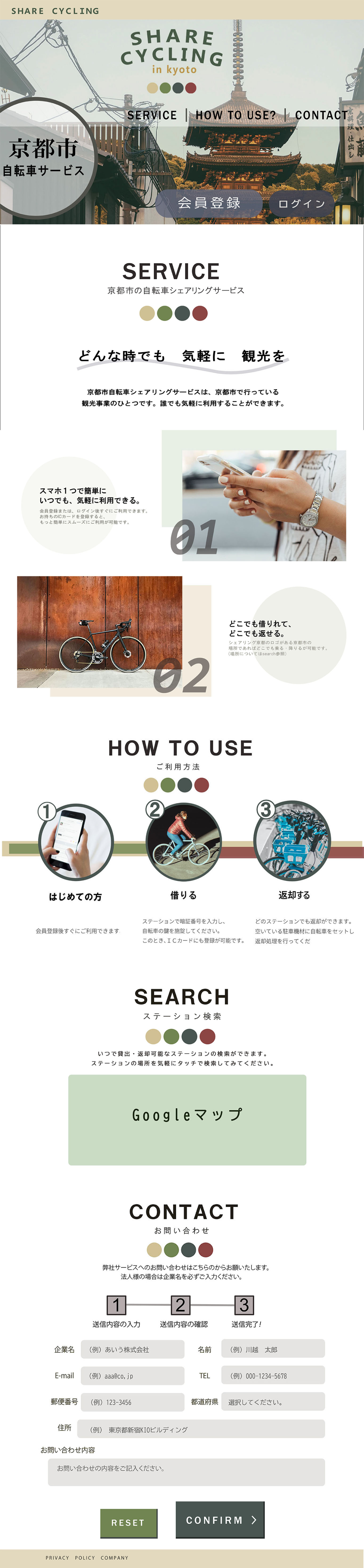 京都観光を促進するために作られた自転車シェアサービスの架空サイトです。 作成 2020