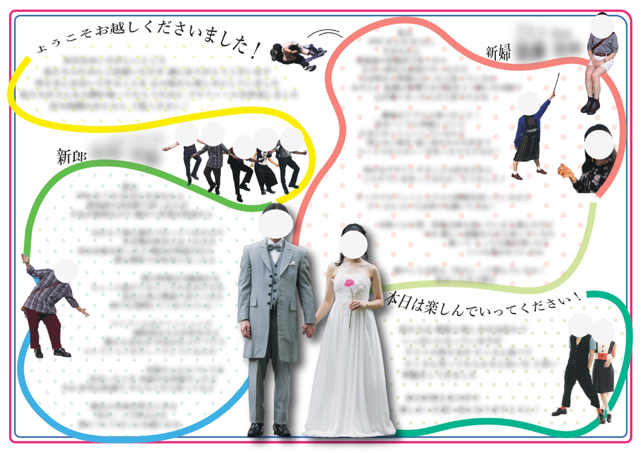 ・新郎新婦の個性的な雰囲気を感じてもらうために、ポップでカラフルな色使いにしました。
