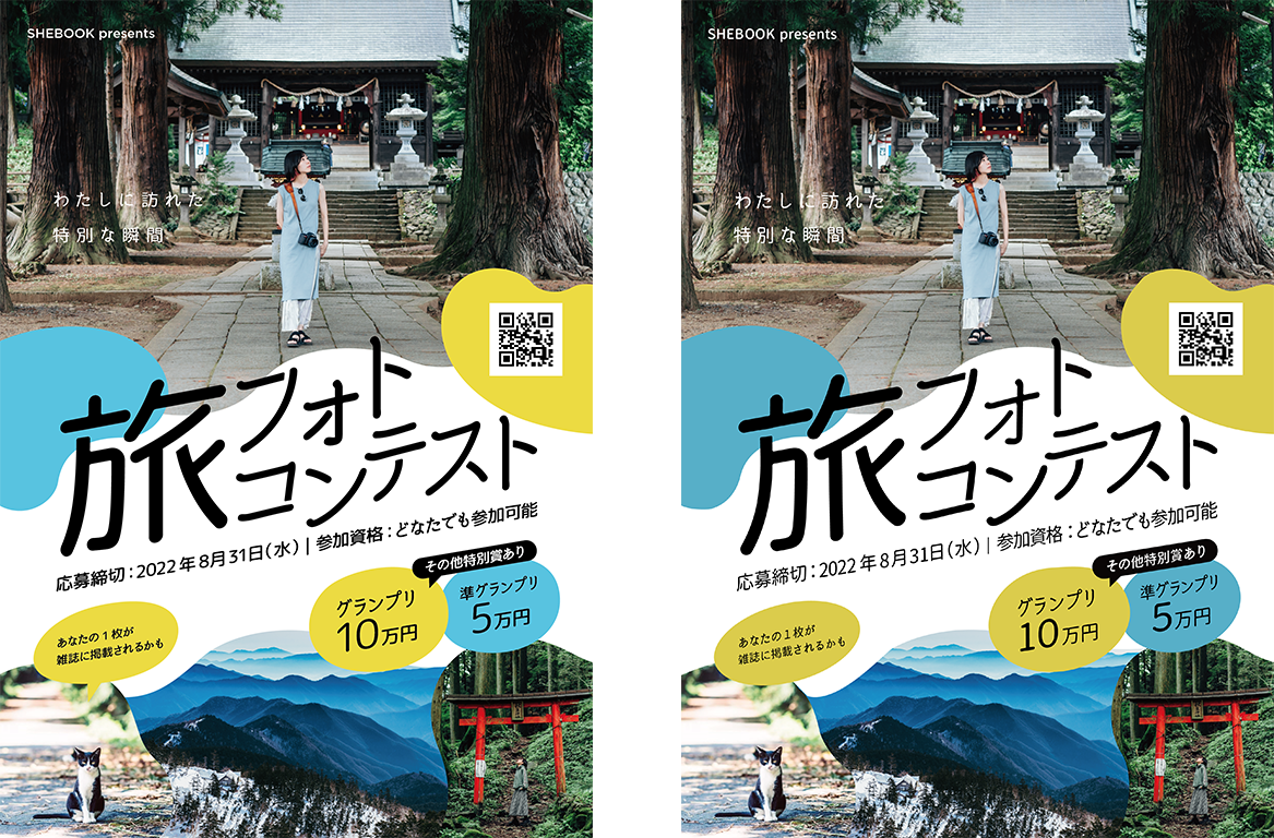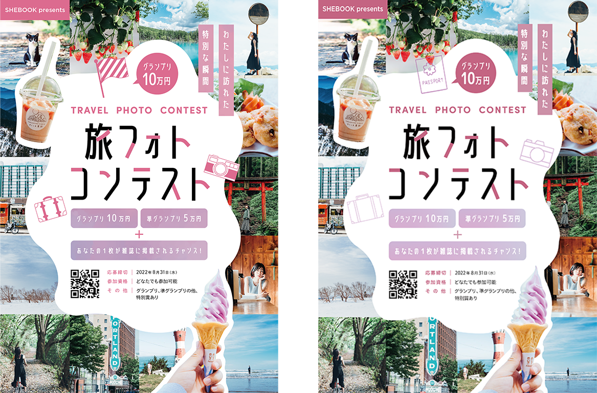 SHElikesの演習型コンテンツ【SHEデザインドリル】より「旅フォトコンテスト」のフライヤー2種のトレースと、自主制作を行いました。 [制作期間:トレース各2時間、自主制作4時間 / 使用ツール:Illustrator] YEAR 2024