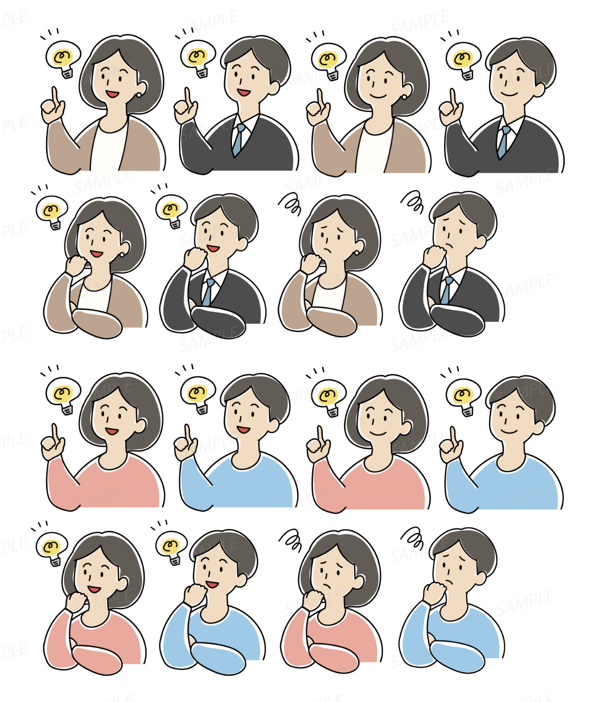 ストックイラスト Mayu Sato フリーランスWebデザイナー/ストックイラストレーター OVERVIEW 人物のイラスト素材 ストックイラストサイトに素材登録をしています。Q&Aやワンポイントでよく使う人物のイラストを制作しました。ビジネスシーンでも使いやすいよう、スーツの差分も制作しました。
