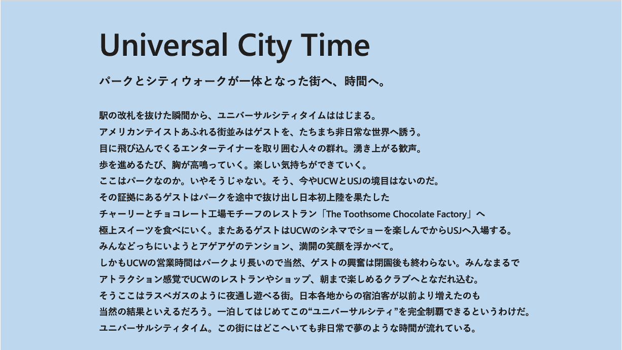 ユニバーサル・シティウォーク大阪/施設コンセプト開発 MASATERU ARAKI クリエイティブディレクター・コピーライター OVERVIEW UCWの運営を長年担当している関係から、今後のリーシングに関わる施設コンセプトの開発依頼を受注。役割:CD+企画+C