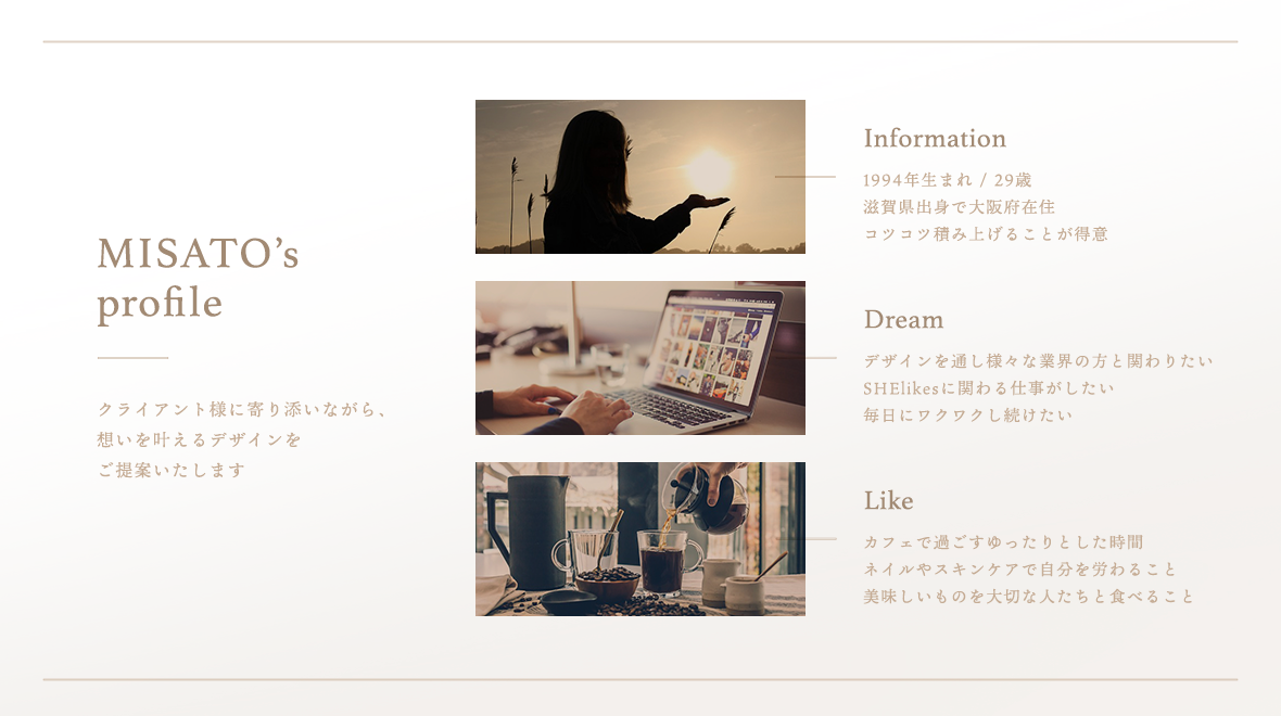 本ページをご覧いただきまして、誠にありがとうございます。 私自身の紹介やデザインをする上で大切にしていることを記載いたしております。