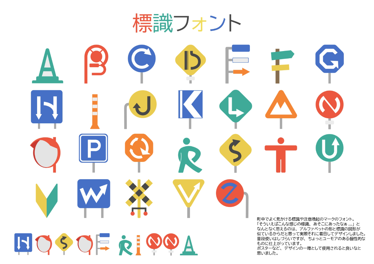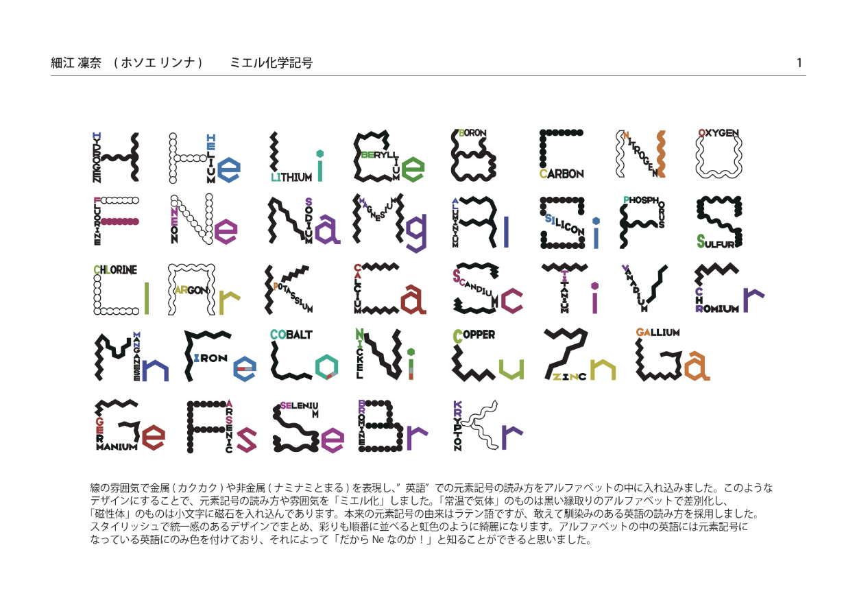 授業で制作したオリジナルのフォント、架空のお店のロゴ、そして元素記号です