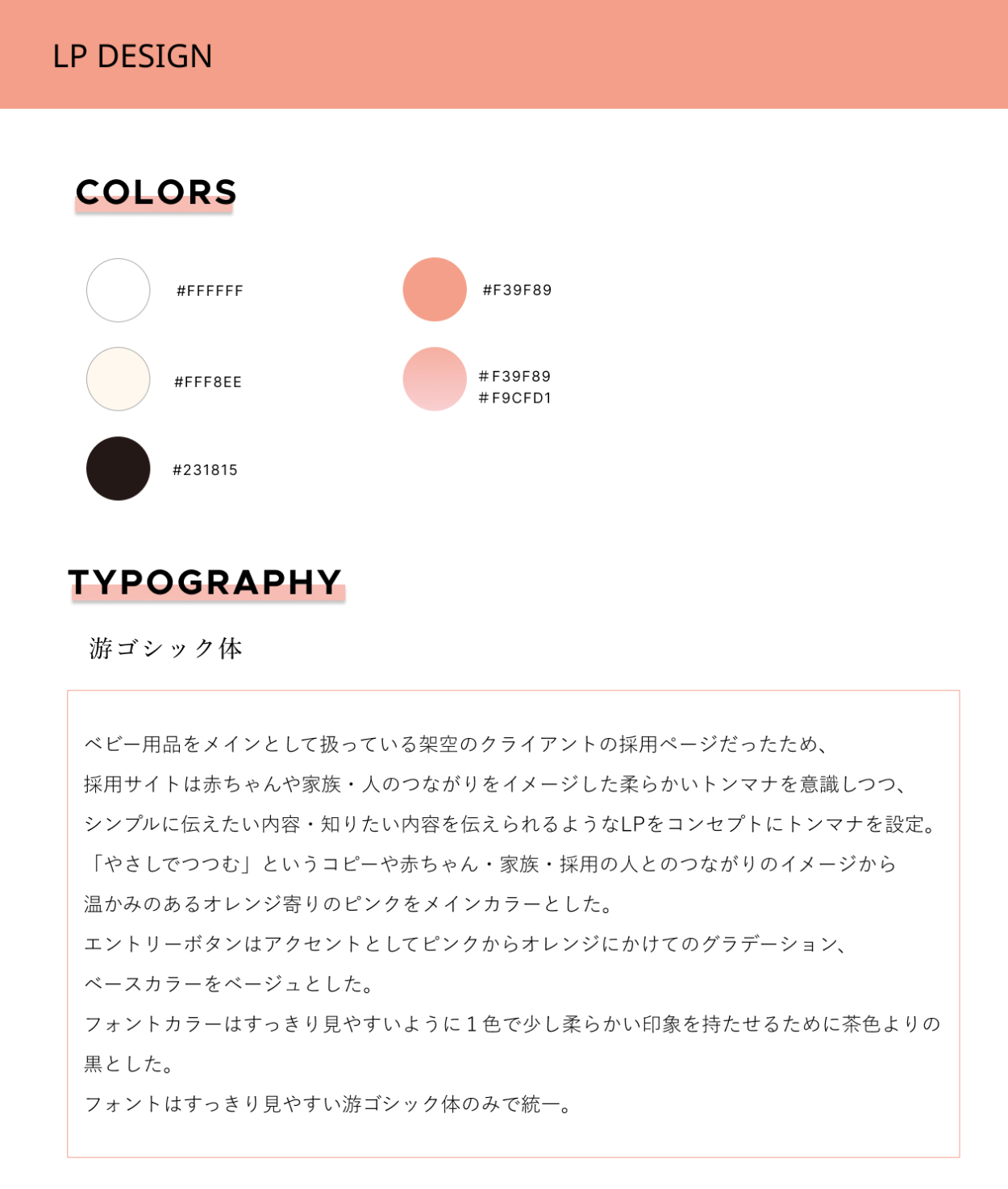 要件書やペルソナからムードボードを作り、トンマナの設定に力を入れました。今回は採用サイトであったため、クライアントのHPのトンマナを崩さないように、採用サイトとしての役割をしっかり考えてトンマナの設定をしました。