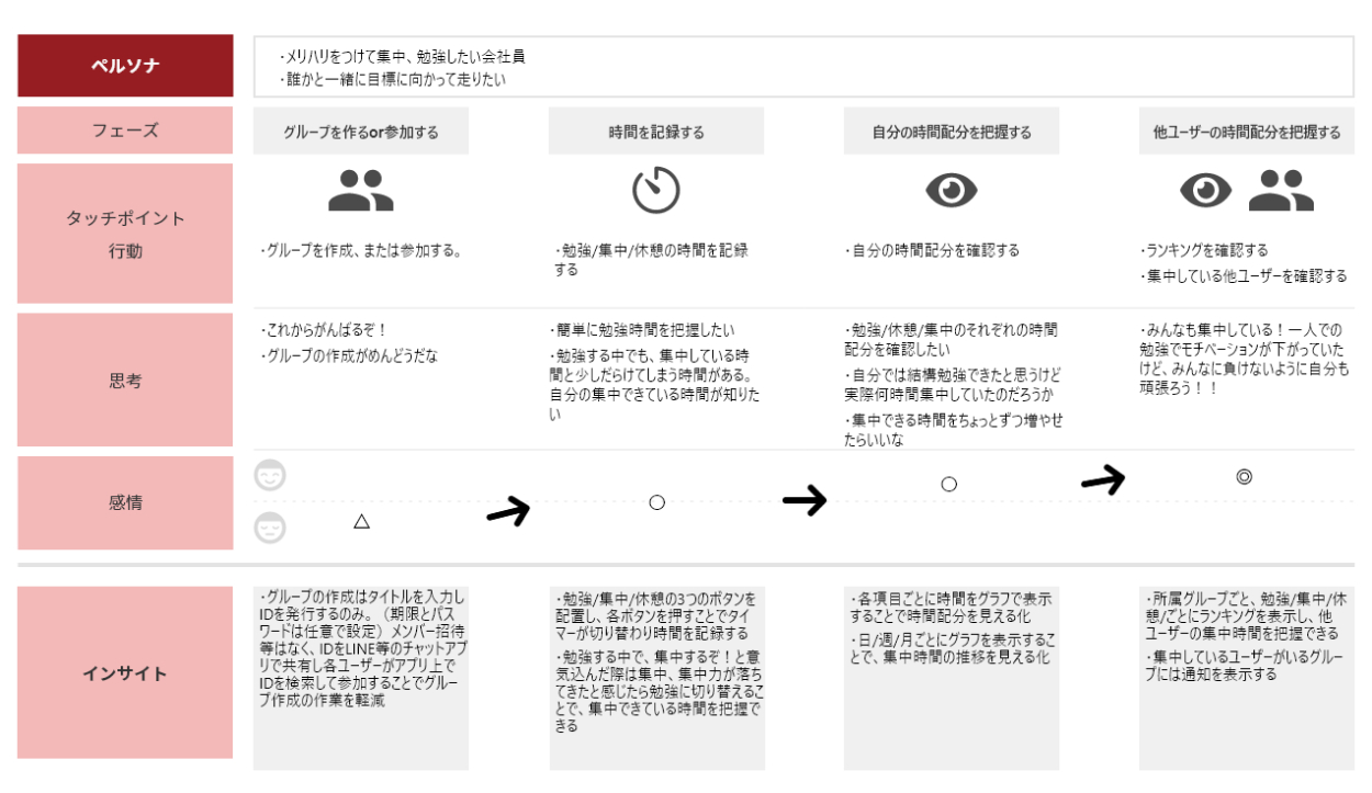 ペルソナの課題を解決するために、上記のカスタマージャーニーマップを作製しました。