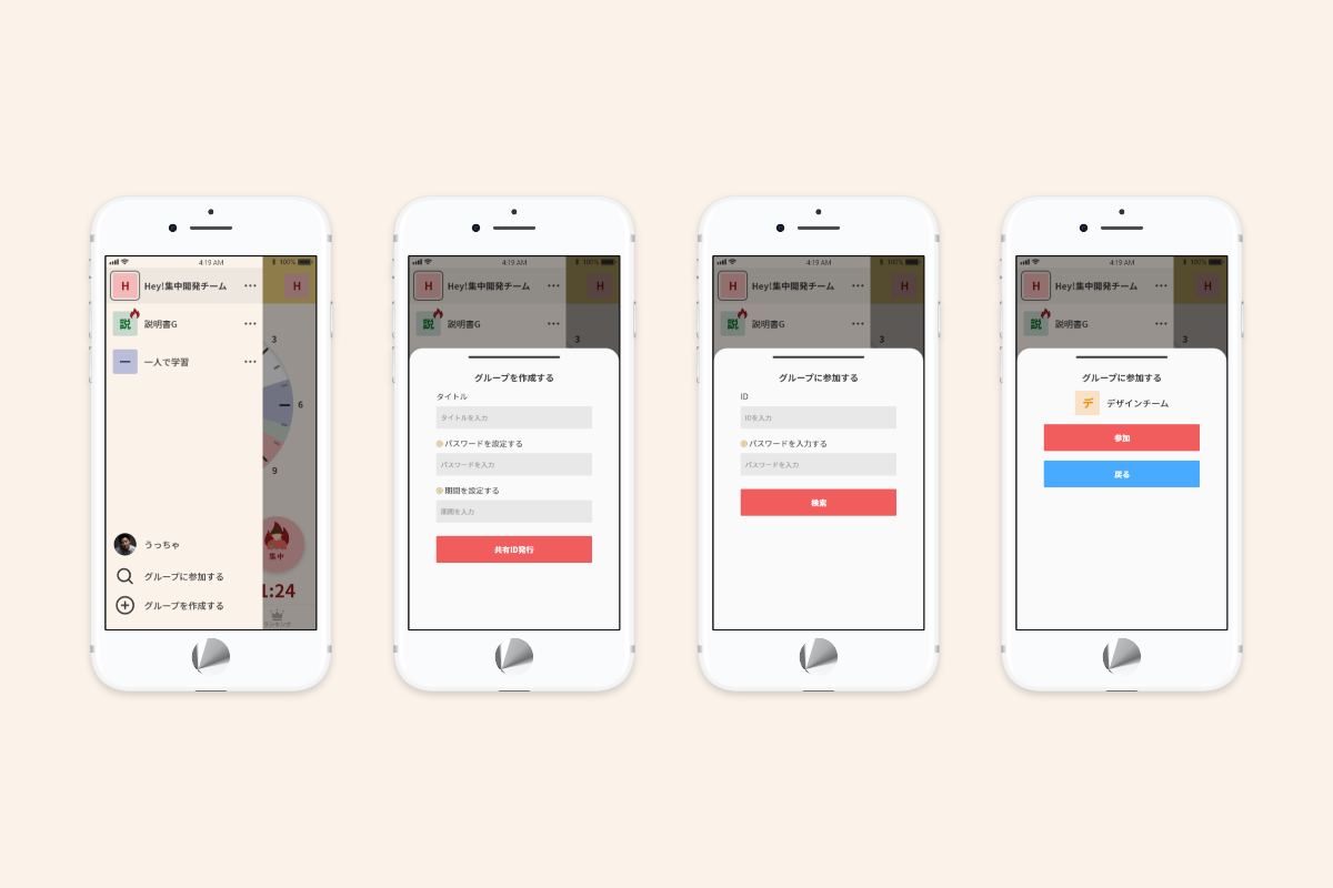 ・グループ作成はタイトルを決めてIDを発行するだけ(パスワード/期限は任意で設定可、IDの共有はLINE等のメッセージアプリ)
