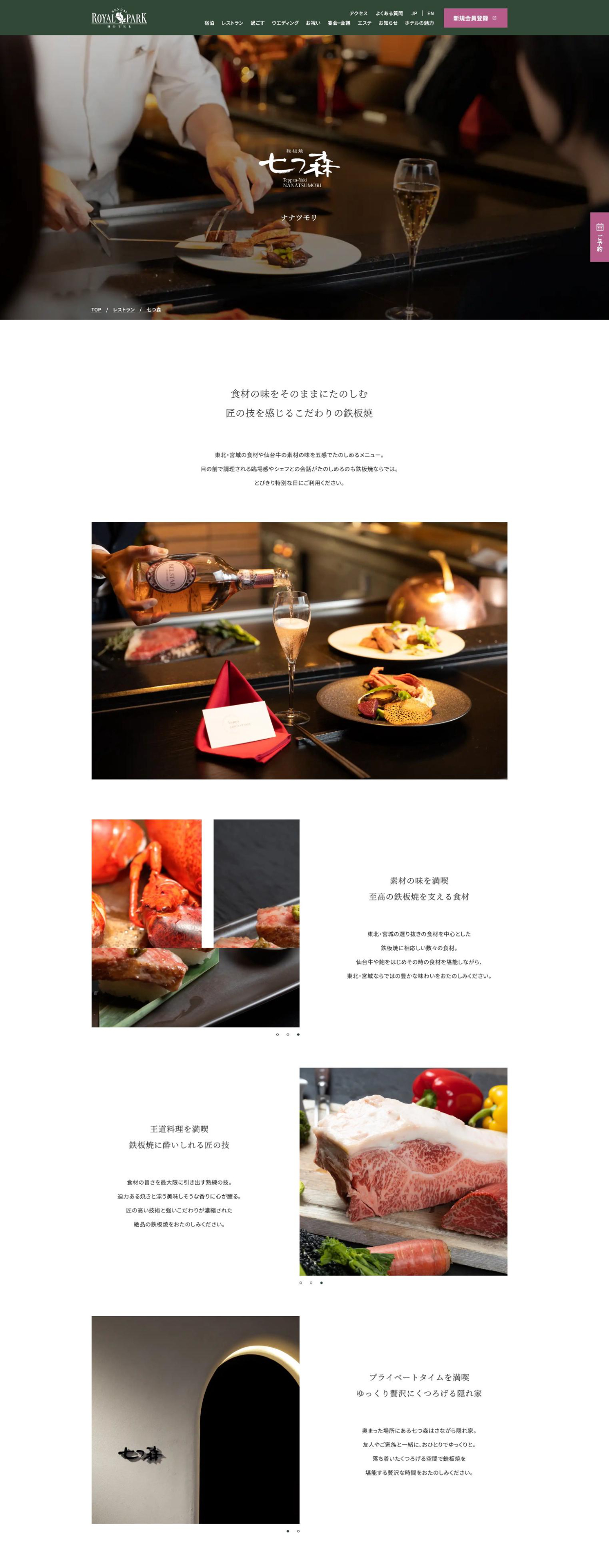 株式会社ロイヤルパークホテルズアンドリゾーツ様の「仙台ロイヤルパークホテル」「横浜ロイヤルパークホテル」「日本橋ロイヤルパークホテル」の3サイトを同時リニューアルするプロジェクト。 React(Gatsby.js)を使用したフロントの実装を担当しました。