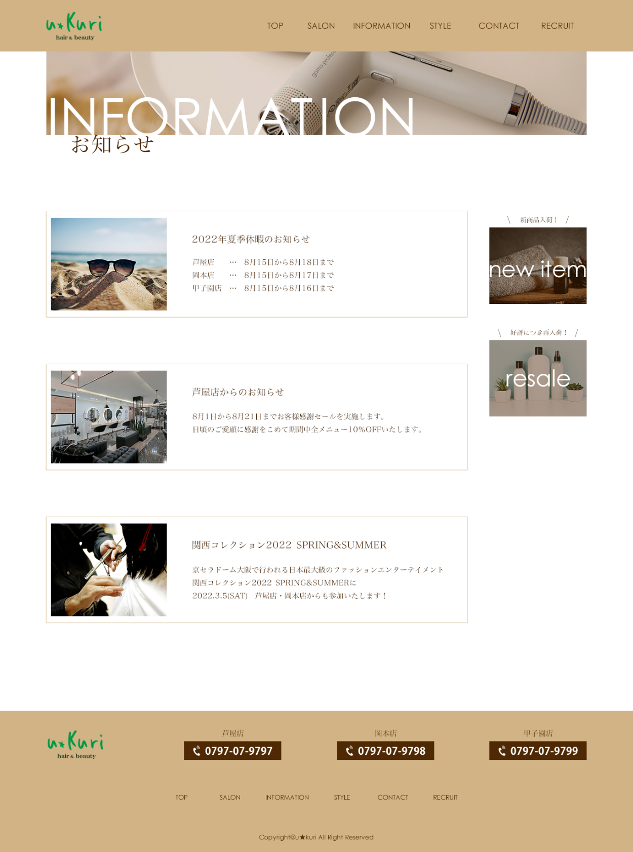 - 店舗増加に伴う新規顧客獲得がサイトリニューアルの意図と考え、サイト閲覧者に予約をしてもらうことをゴールとして、コンタクトをとりやすい設計にするため電話番号をフッターなど随所に配置