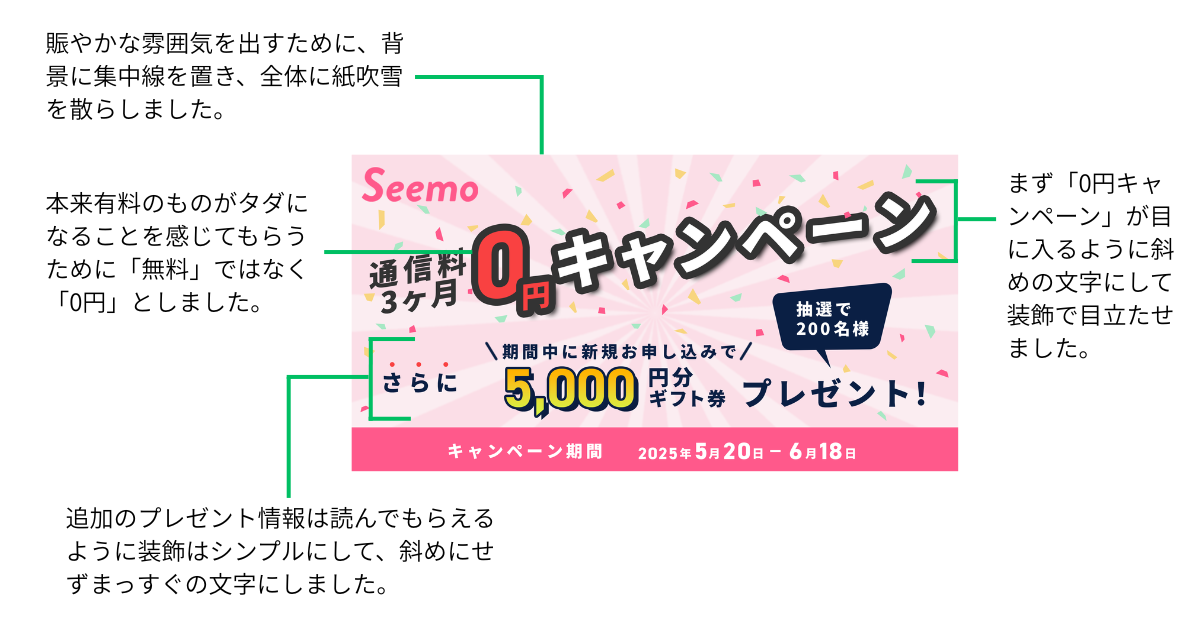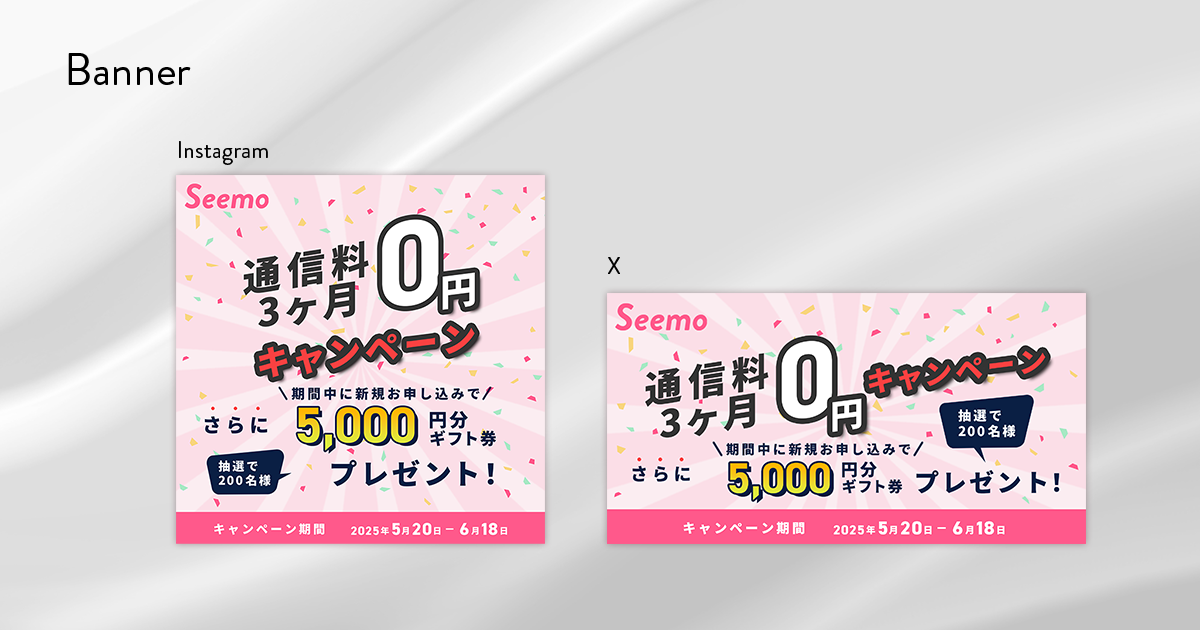 「SHElikesトレーニングプログラム」の課題で、架空の格安SIM業者の新規入会キャンペーンバナーを制作しました。ポップで楽しい雰囲気をイメージしました。(使用ツール:Photoshop)