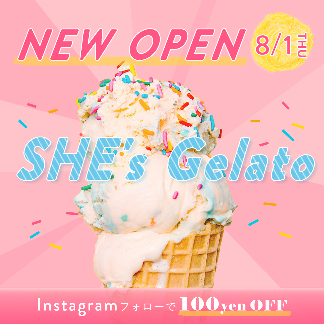 ≪必須要素≫ ①文字「SHE's Gelato」「8月1日(木)」「NEW OPEN」「Instagramをフォローで100円OFF」、②写真やイラスト「アイスクリームの写真を使用」