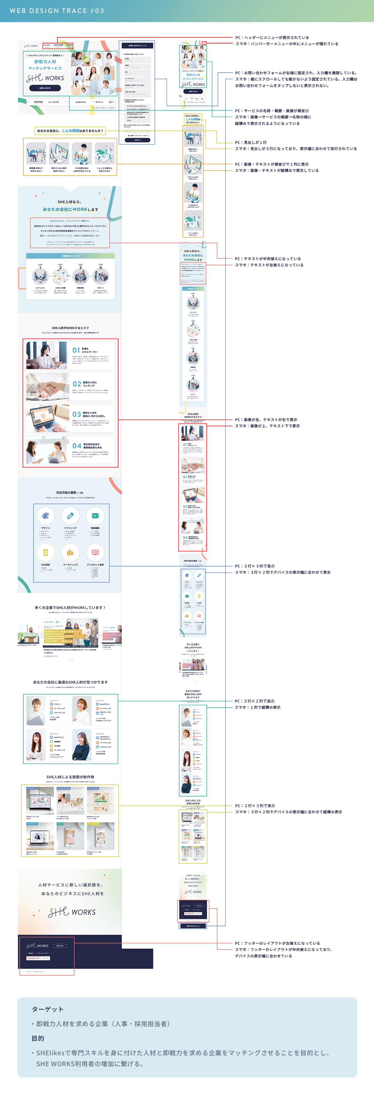 SHElikes MULTI CREATOR COURSE Designerにて、LPトレースの課題に取り組みました。スタイルガイドの作成と、PCとスマホでレイアウトが異なる箇所の分析結果をまとめました。