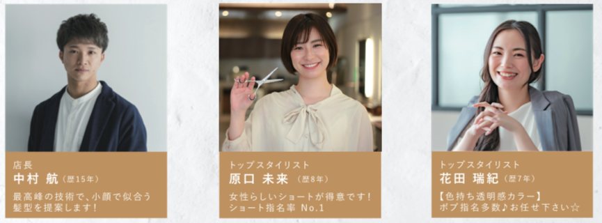 要件書には肩書きと名前のみの記載でしたが、実際に指名したくなるようなキーワード(スタイリスト歴、得意なスタイル)を顔写真とともに掲載しました。