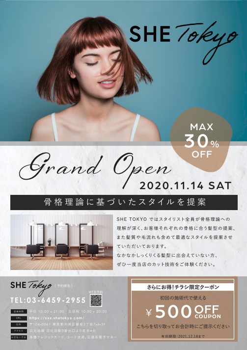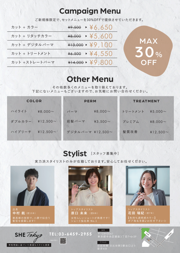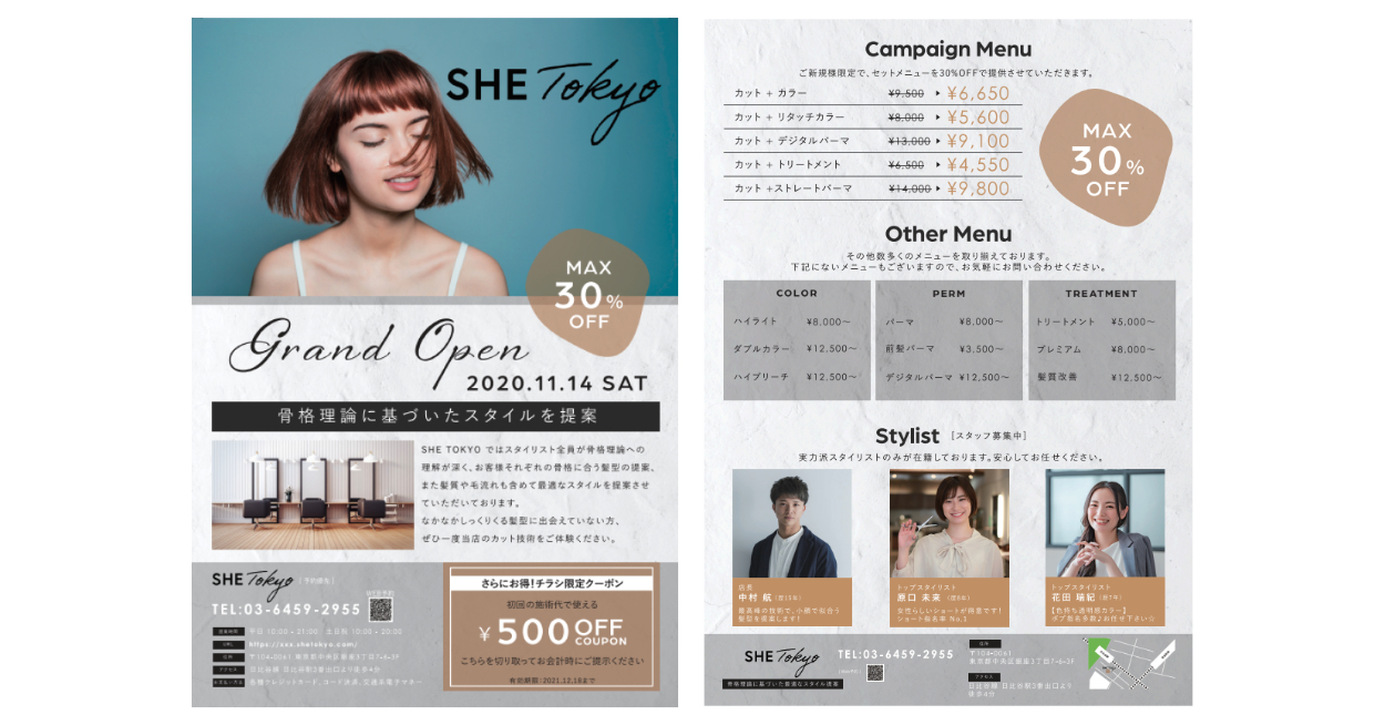 新規オープンする美容室を架空クライアントとした、キャンペーン訴求フライヤー制作に取組みました。(制作期間:約12時間 使用ツール:illustlator)