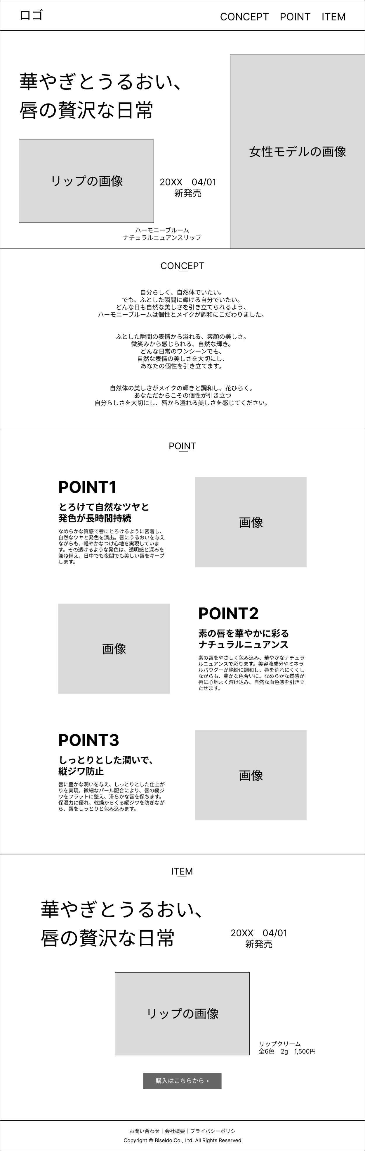 デザインカンプ制作演習 mana Webデザイナー Hertechのデザインカンプ制作演習で作成しました。Webページの要件、手書きのワイヤーフレーム、制作素材は提供は提供されたもとを使用しています。 【ワイヤーフレーム】【デザインカンプ】