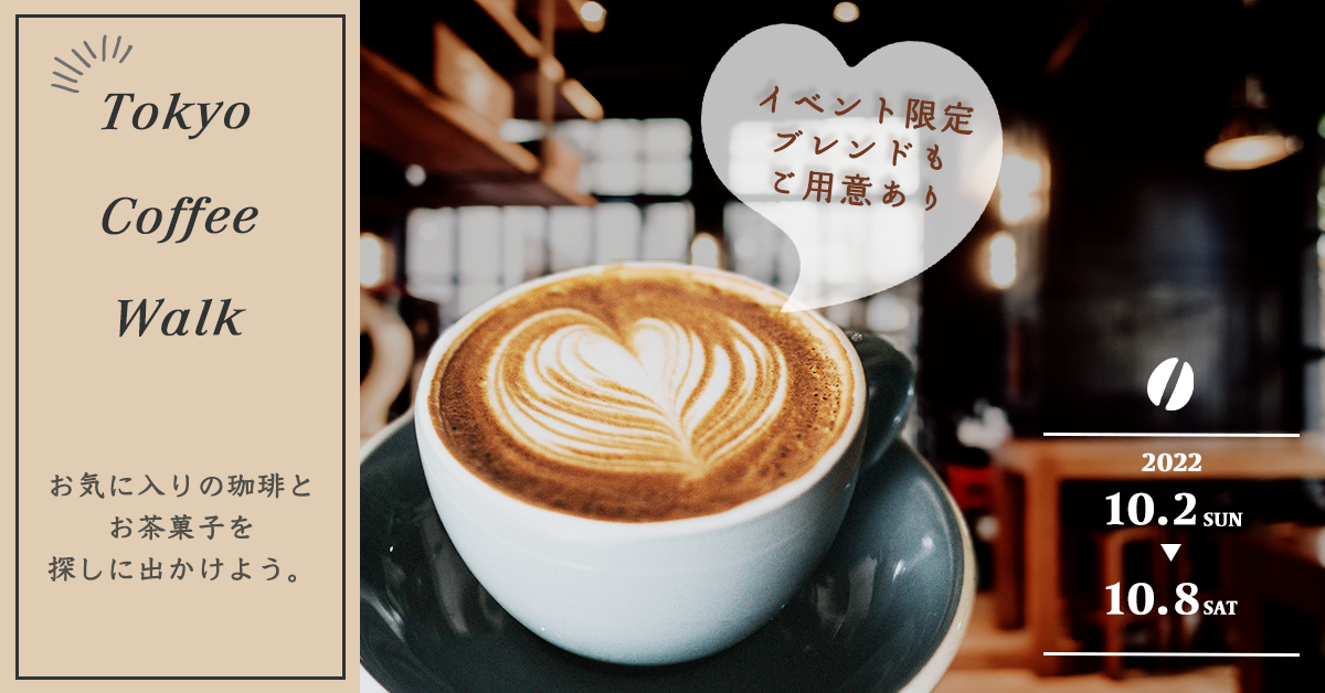 <文言>①Tokyo Coffee Walk②お気に入りの珈琲とお茶菓子を探しに出かけよう。イベント限定ブレンドもご用意あり。③2022年10月2日(日)~2022年10月8日(土)