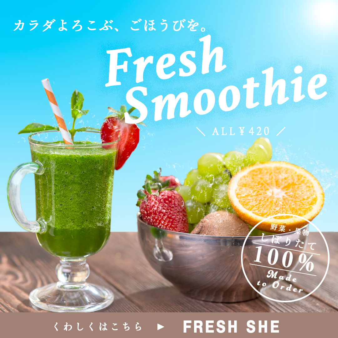 架空のフレッシュスムージー店。ターゲットは「20〜30代の健康意識の高い女性」。訴求ポイントは「フレッシュ感」「明るい配色」。最終目的である「認知拡大」「HPへのアクセス増加」を達成するバナーを制作しました。【制作期間:1日 制作時間:2時間 ツール:Photoshop】
