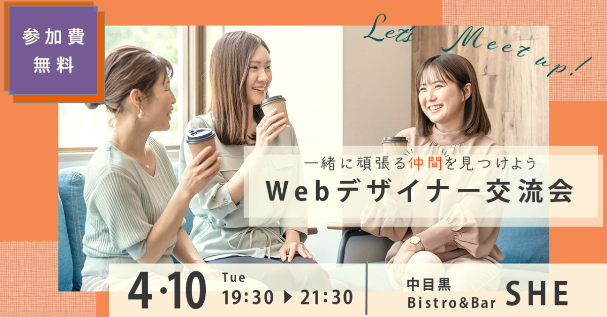 Webデザイナーとして仲間を見つけるための規格なので、参加しやすいように温かみのある色合いを意識して作成しました。 参加日が無料なので目立たせるために補色を設定しようとしましたが、青色だと冷たい印象になったため補色にに近い色を設定し、なおかつ視認性を高めるために文字は白色にしました。 オフライン会のため場所や日時はしっかりと明記しわかりやすいようにしました。 写真は和やかな雰囲気のものを使用し、あえてパーティー感のない雰囲気のものを使用しました。 (わいわい感がない方が、参加しやすい方も多いと考えました。)