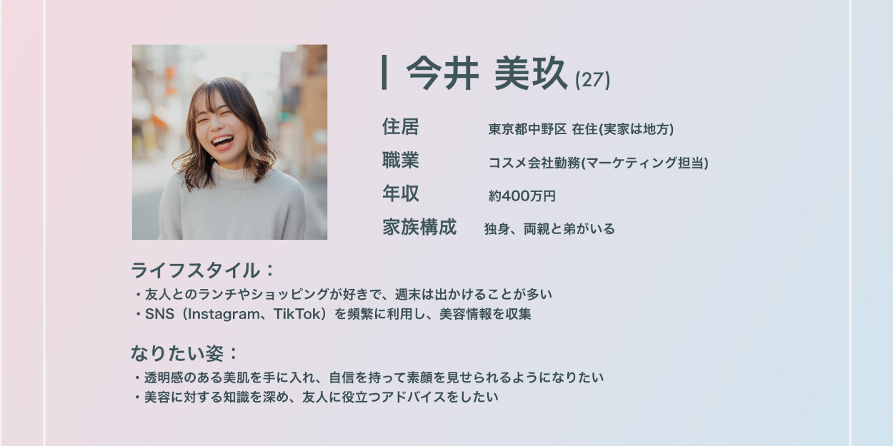 高品質な商品が「自信」をもたらし、なりたい姿に近づき自己肯定感が高まることでターゲットに「笑顔」が生まれ、無添加素材のスキンケアが肌を美しく保つことから「清潔感」を抽出しました。