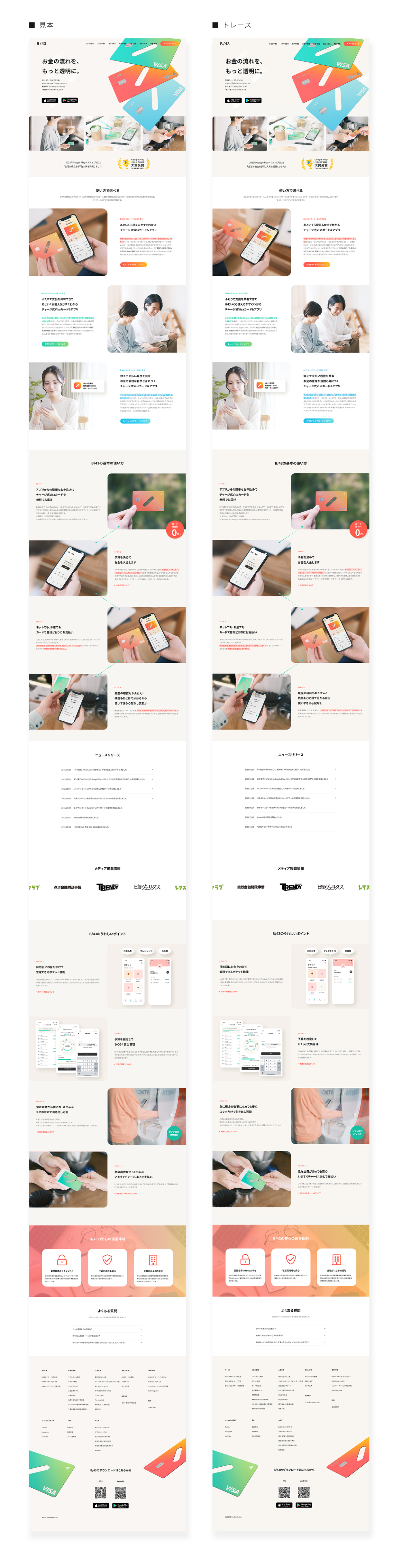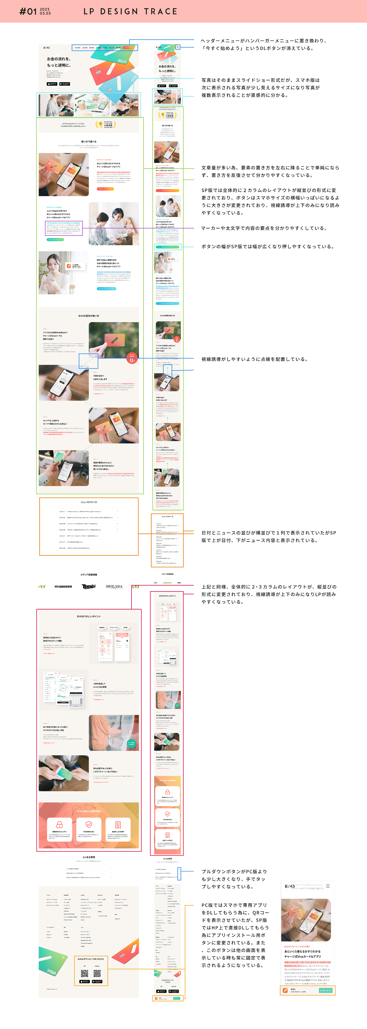 全体的に要素が多かった為、トレースをしているとレイヤーがぐちゃぐちゃになってしまったので、レイヤーをグルーピングしたり細かく整理する癖はLPを作成する上でとても大切なことだと感じました。また分析をする上でターゲットと目的を明確にさせることで色・タイポグラフィ・間隔の選び方が大きく変わることを学びました。