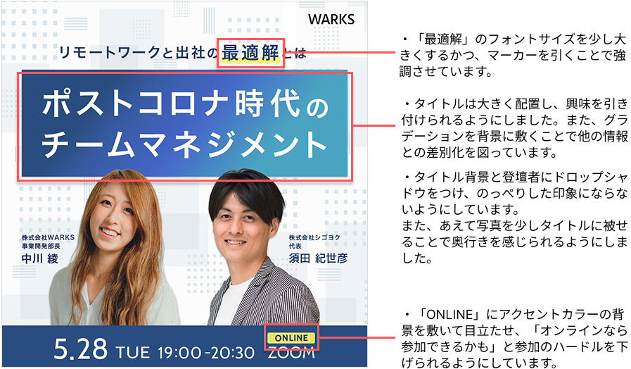 ・背景には、ビジネス感を意識して正方形やストライプなどの直線的なあしらいを入れています。不規則に並ばせることで、トンマナにある「新時代(=型にはまらない)」なイメージを持たせています。なるべく小さなサイズで背景に入れることでカジュアルになりすぎないようにしています。