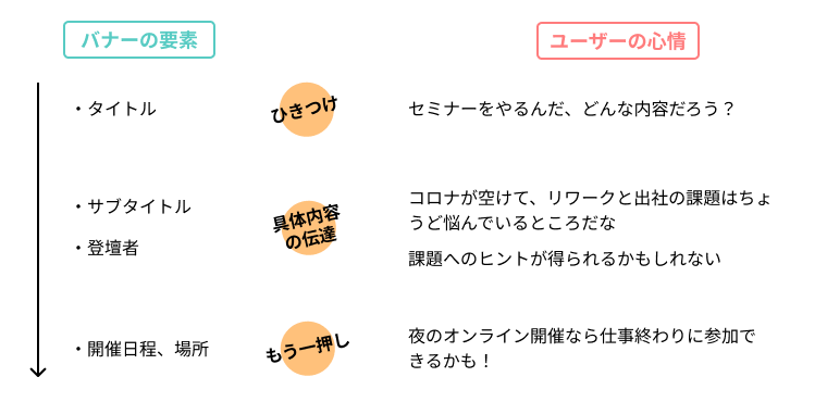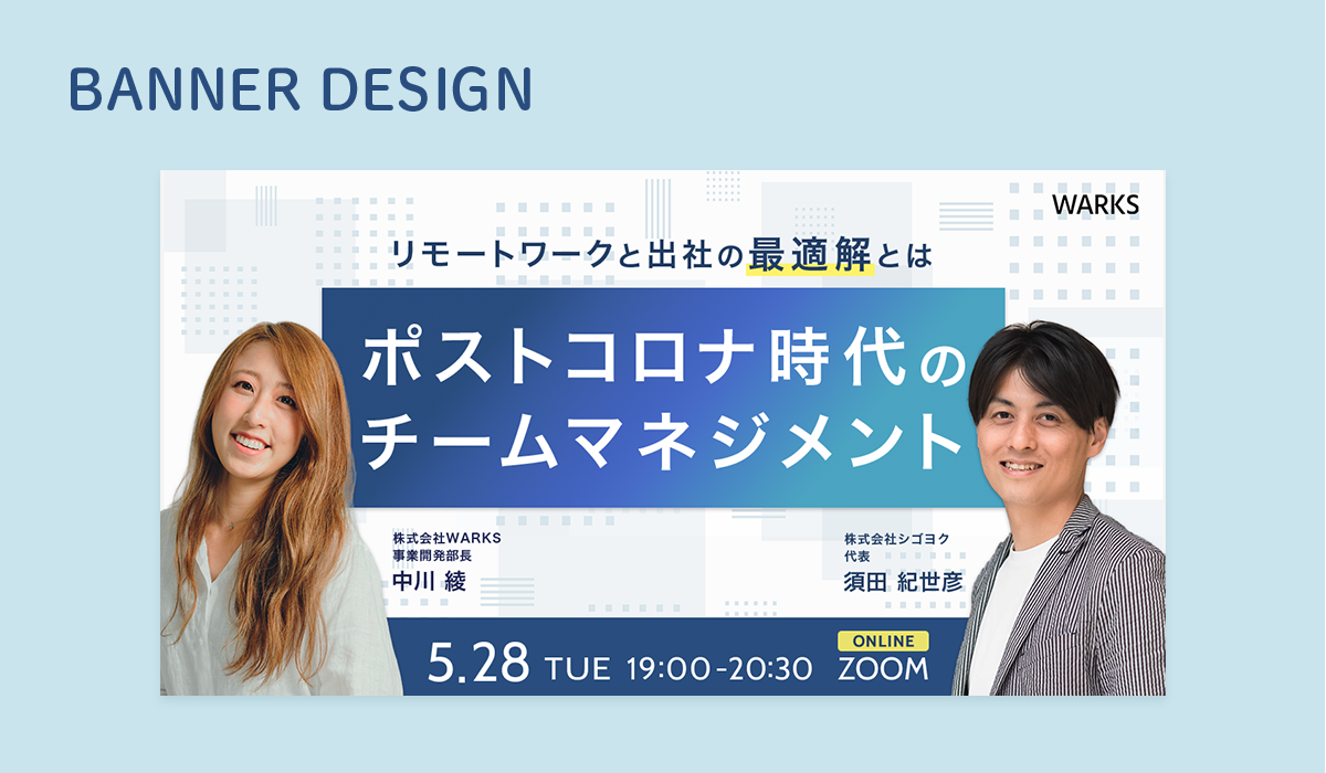 ・メインカラーにはビジネス感、信頼感を出すために紺に近い青色を使用しています。背景が明るい分、文字色などに使われている紺色は暗くすることでバナーの印象を引き締めています。