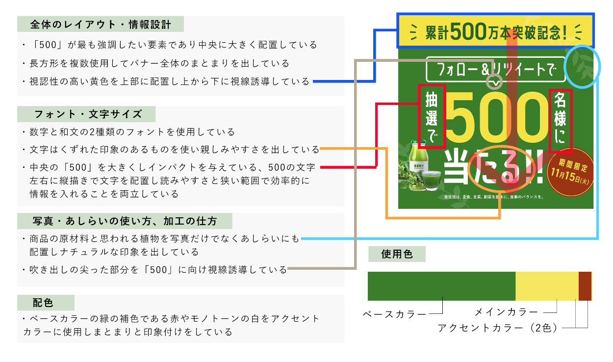 このバナーのターゲット・目的は何か、全体のレイアウト・情報設計はどのようにされているか、使用しているフォント・文字サイズ・写真やあしらいの使い方・加工の仕方・配色はどのようにしているか、について観察し言語化した。