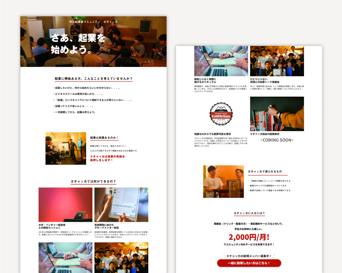 起業を志す学生が集まるコミュニティの集客用LPの制作。 コミュニティ参加者の進路として、起業だけでなく就職の窓口も用意しており、 「事業開発ができる学生」に興味のある採用担当者様向けのLPも制作した。