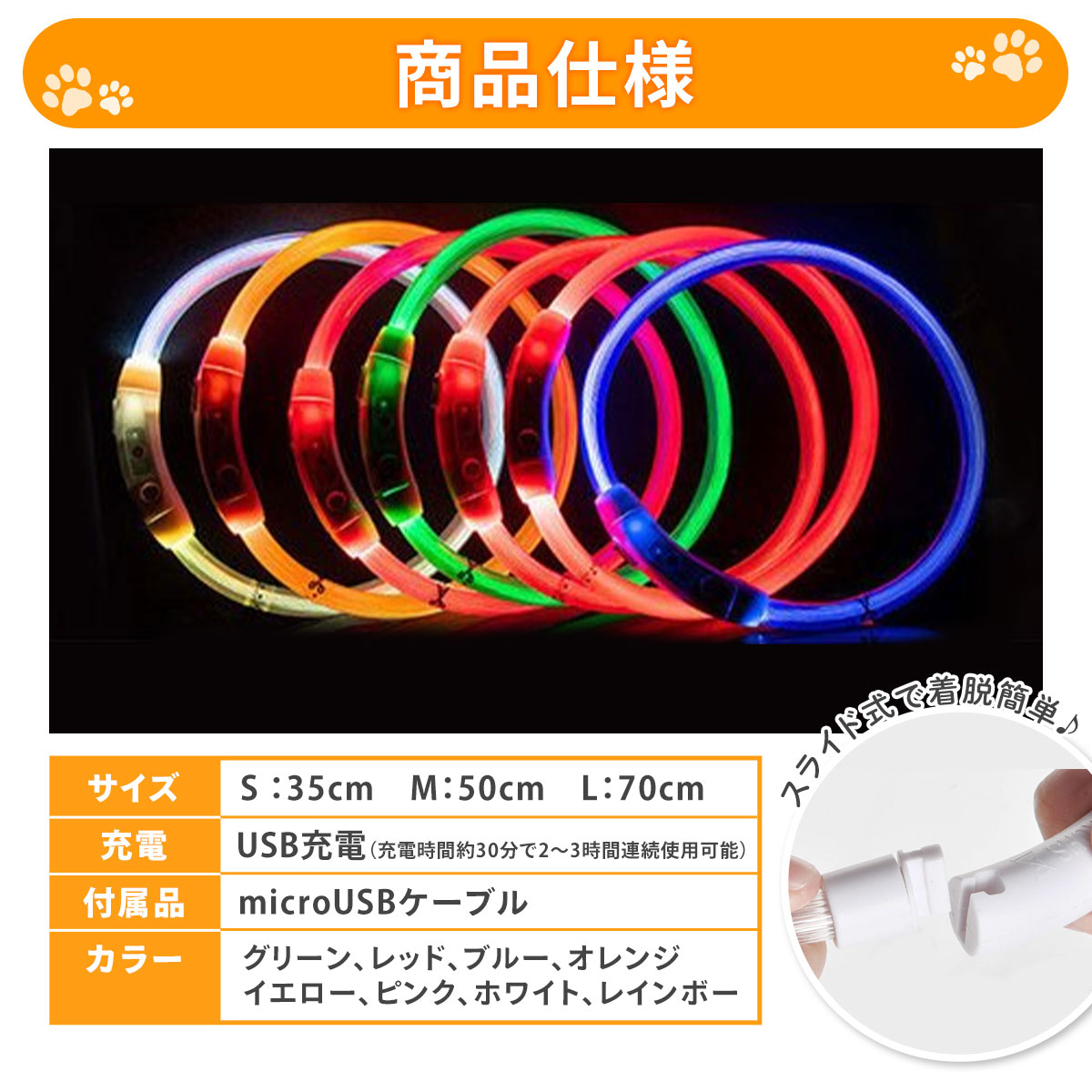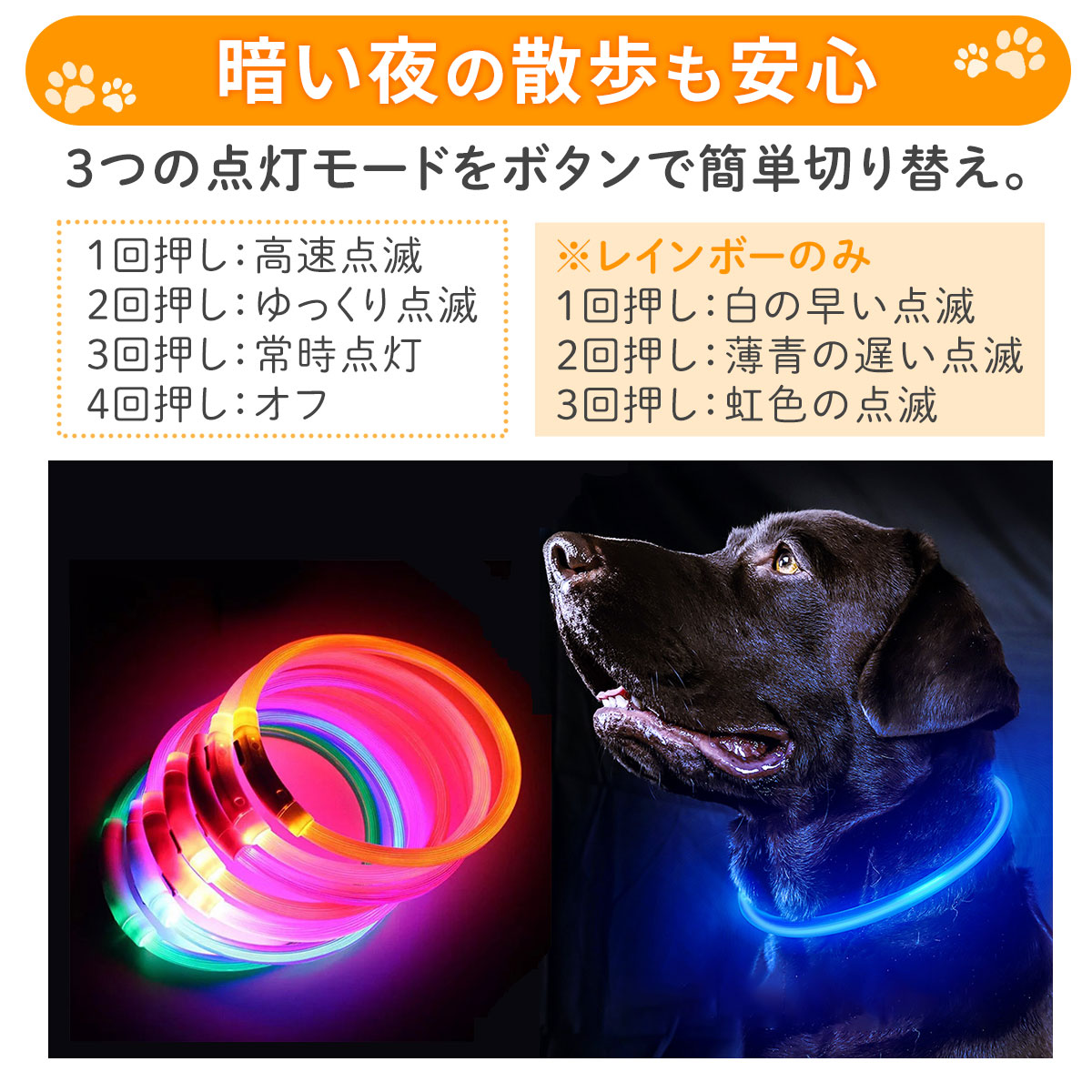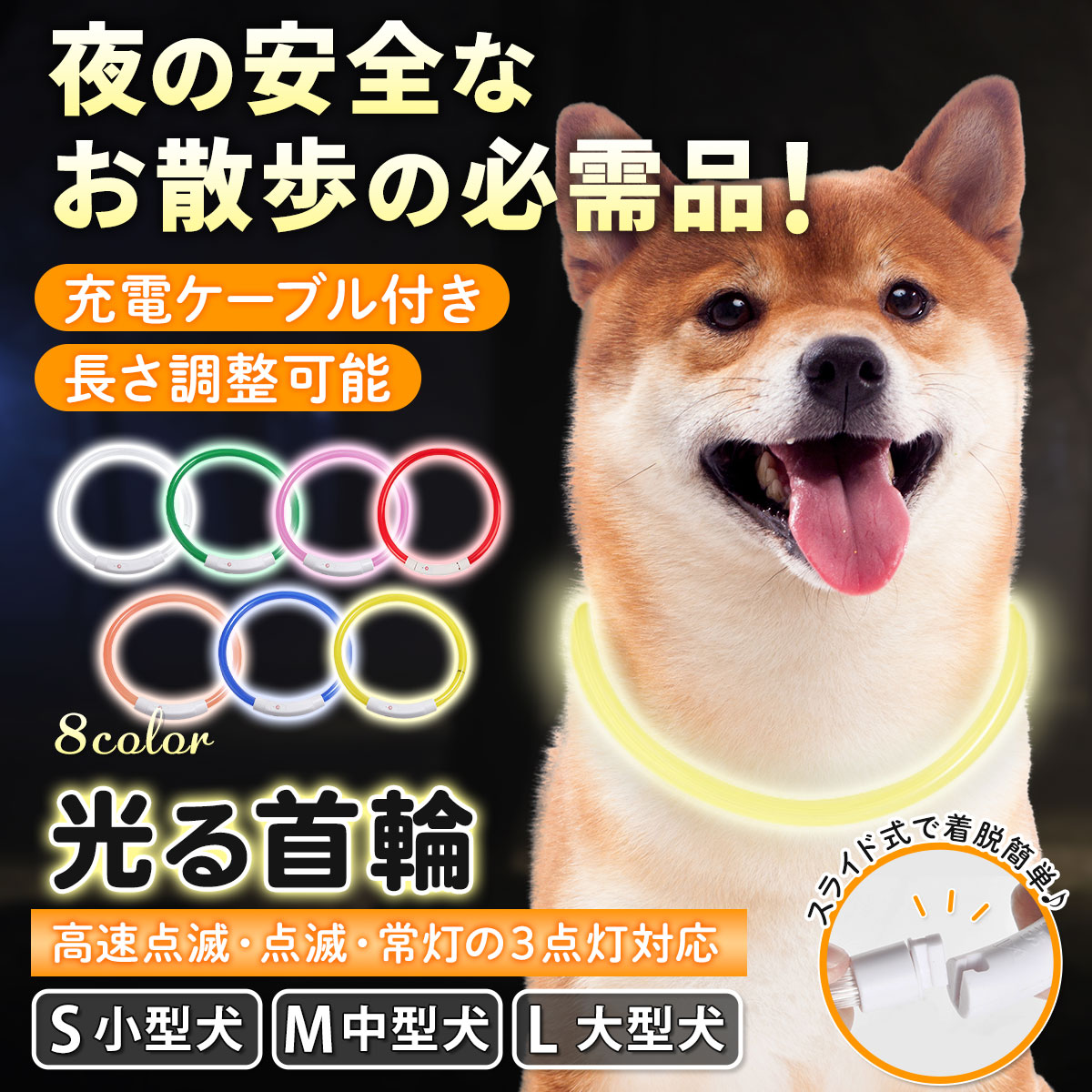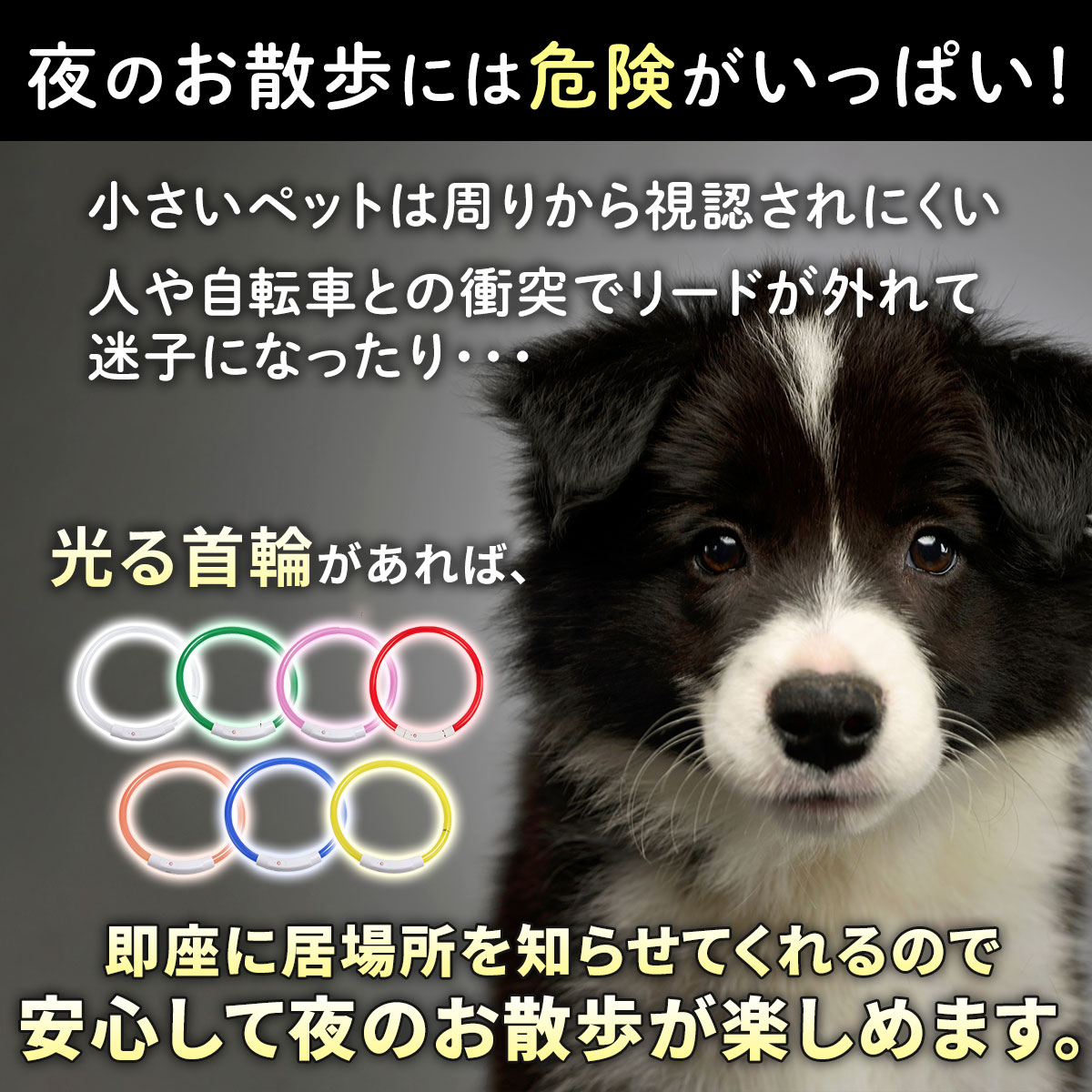 光る首輪の商品画像 yoko フリーランスWebデザイナー ヤフーショッピングで使用される光る首輪の商品画像を制作ターゲット:20代〜50代 男性女性 使用ツール:Photoshop・Illustrator