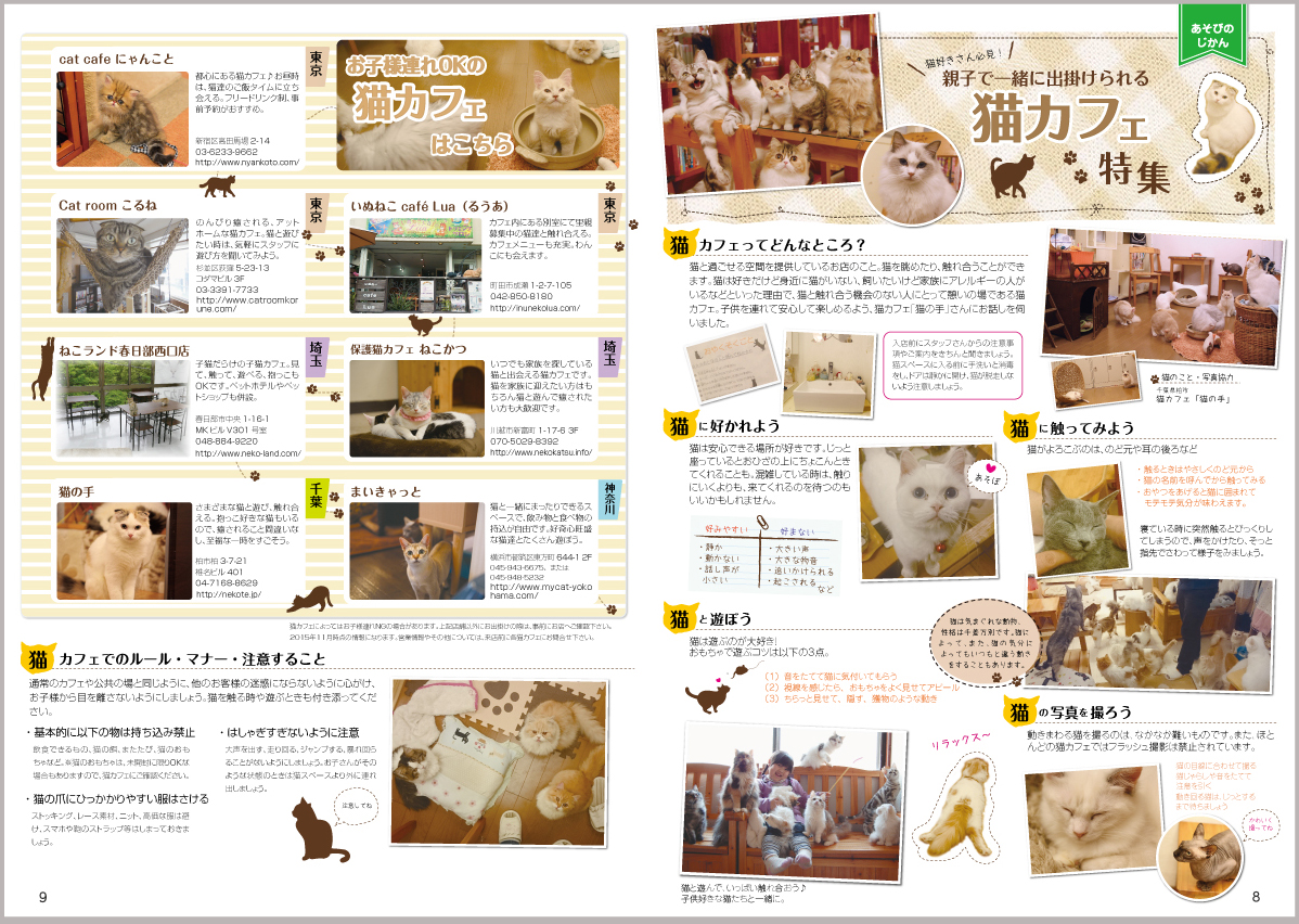内 容:子ども連れOKの猫カフェ情報と猫カフェでのマナーを特集。猫カフェは、どんなところで、どんなルールがあるのかなどを紹介し、猫カフェで楽しい時間をすごせるように、猫に好かれるためのコツを猫カフェ経営している方に取材した内容をまとめました。