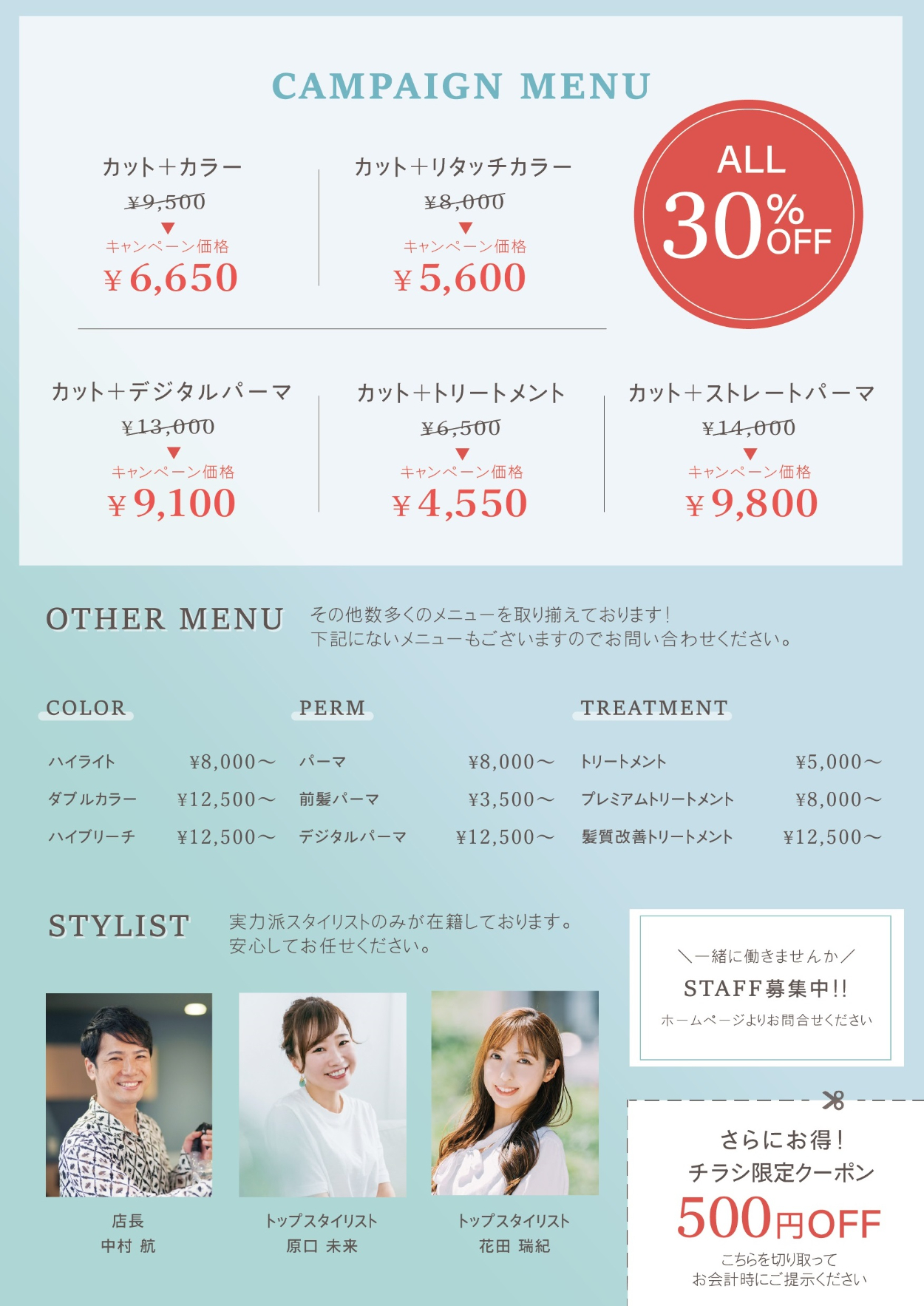 SHElikes MULTI CREATOR PROJECTの課題として架空クライアント依頼という設定で、新規オープンする美容院のフライヤー制作を行いました。
