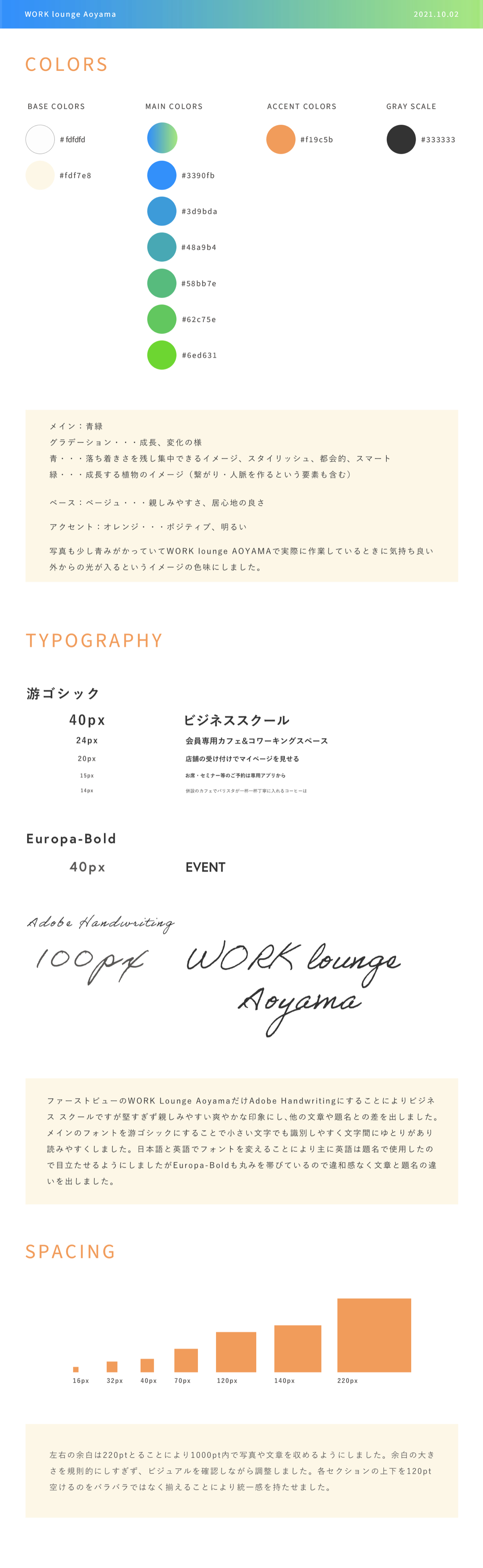 - ターゲットやペルソナから情報設計をしっかり考え込まないとワイヤーフレームの時点でデザインがなかなか決まらなかったりデザインカンプを考えるのも難しいとわかりました。昔はよく情報設計をあまり細かく考えずにデザインしていたこともありそのような時は説得力のあるデザインができなかったので今回特に情報設計の大切さがわかりました。