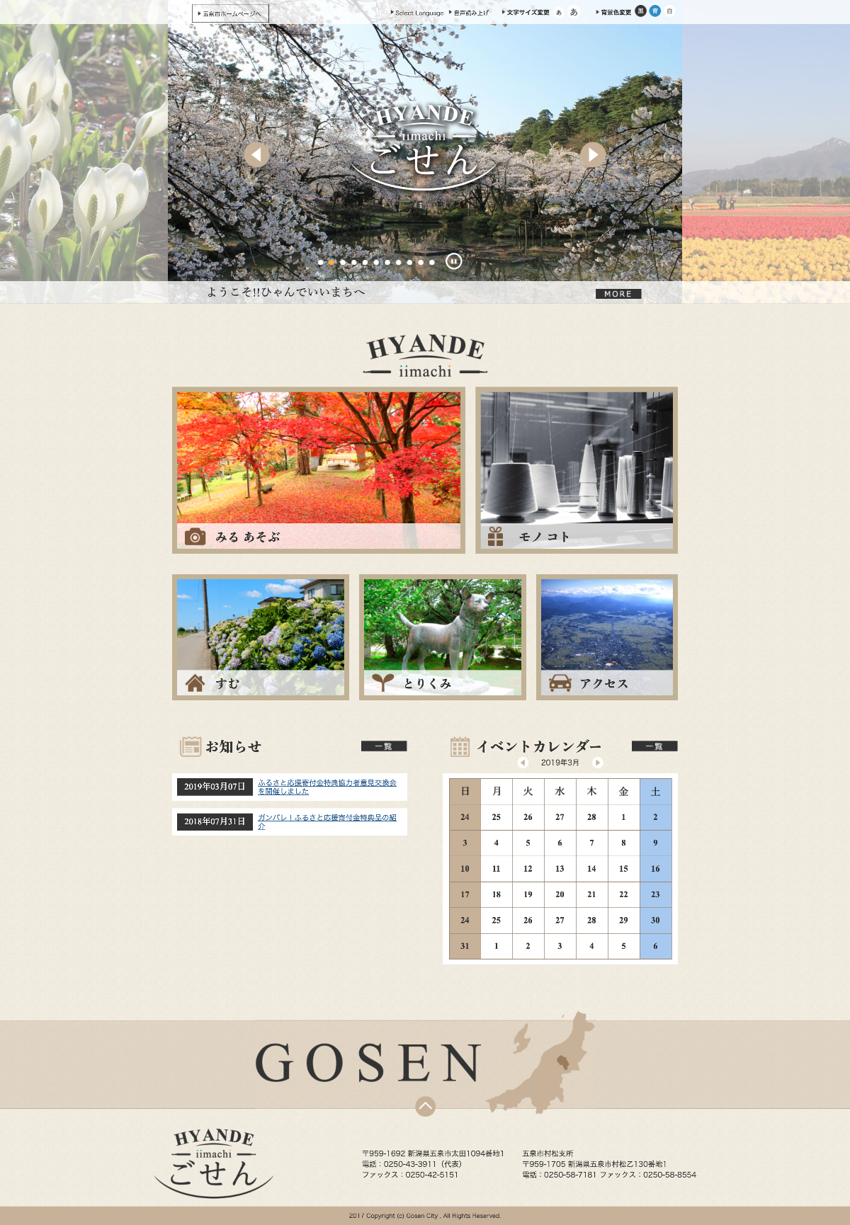 今回のリニューアルと共に作成した市のブランディングサイト。「五泉市」というブランドをビジュアルと読み物で押し出している。「ひゃんで」とは五泉市の方言で「とても」という意味。