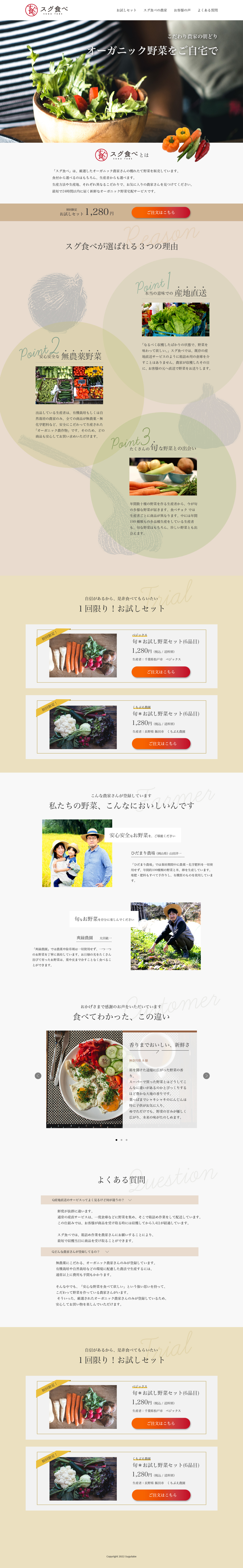 スクールの課題で、架空のオーガニック野菜宅配サービスのLP(ランディングページ)を制作しました。用意されたヒアリングシートをもとに、ワイヤーフレームの作成、デザインカンプ、コーディングを行いました。(制作期間:1ヶ月)