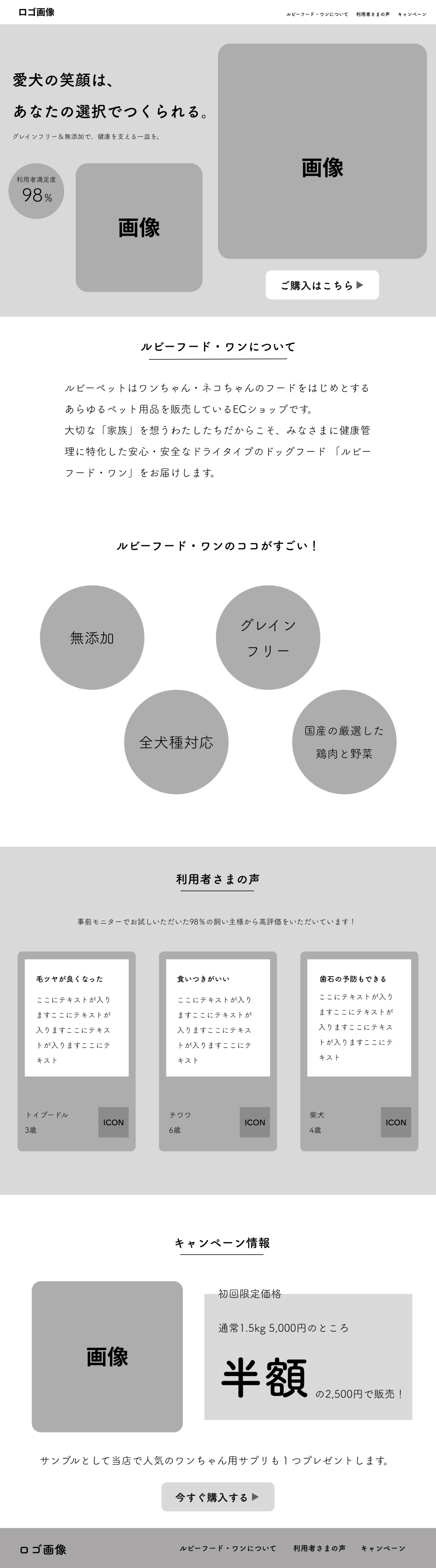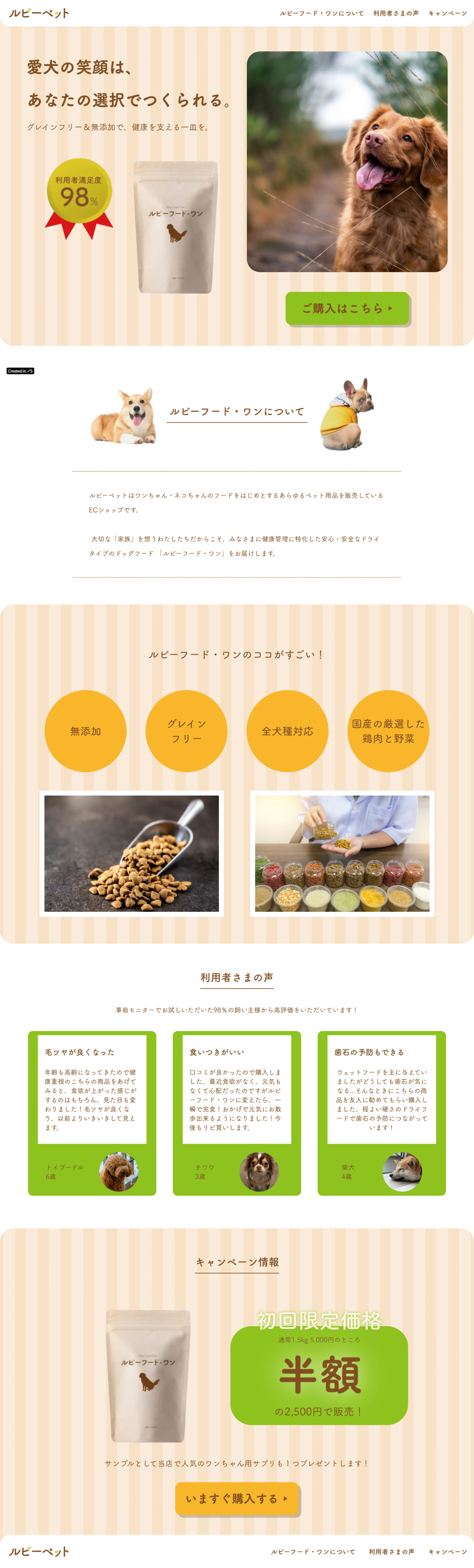 LPの目的:ワンちゃんの健康管理フード「ルビーフード・ワン」を販売開始することになりました。GDNバナー広告、リスティング広告、弊社公式HP内バナーからLPへ誘導し、購入していただく流れになります。新発売キャンペーンとして初回のみ半額2,500円で販売、サンプルとして当店で人気のワンちゃん用サプリも1つプレゼントします。