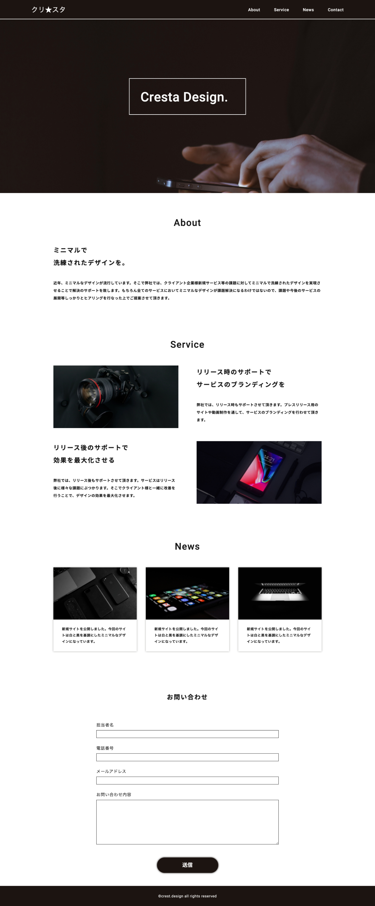 学習サイト(クリ★スタ)課題初級編 mayu クリ★スタ(webデザイン学習サイト)からデザインカンプをダウンロードし、コーディングを行いました。使用ツール:VSCode、AdobeXD所要時間:8時間作業内容:コーディング