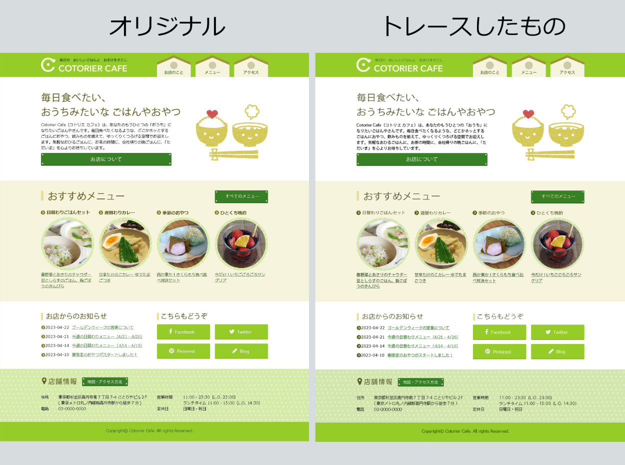 東京都の職業訓練校(早稲田電子IT教育センター)の課題で架空のカフェ「Cotorier Cafe」のデザインカンプをIllustratorでトレースしました。