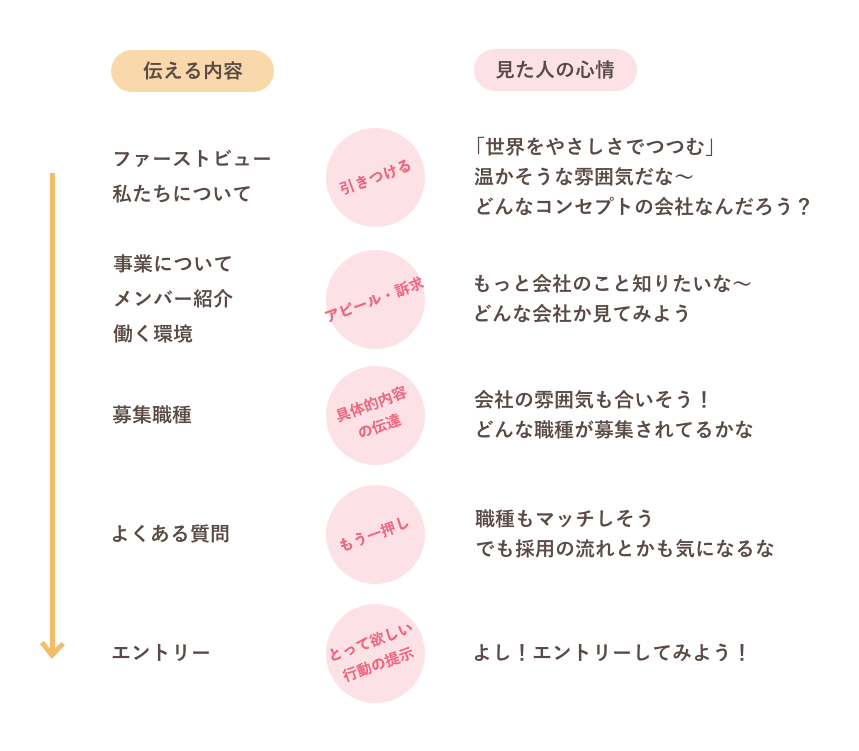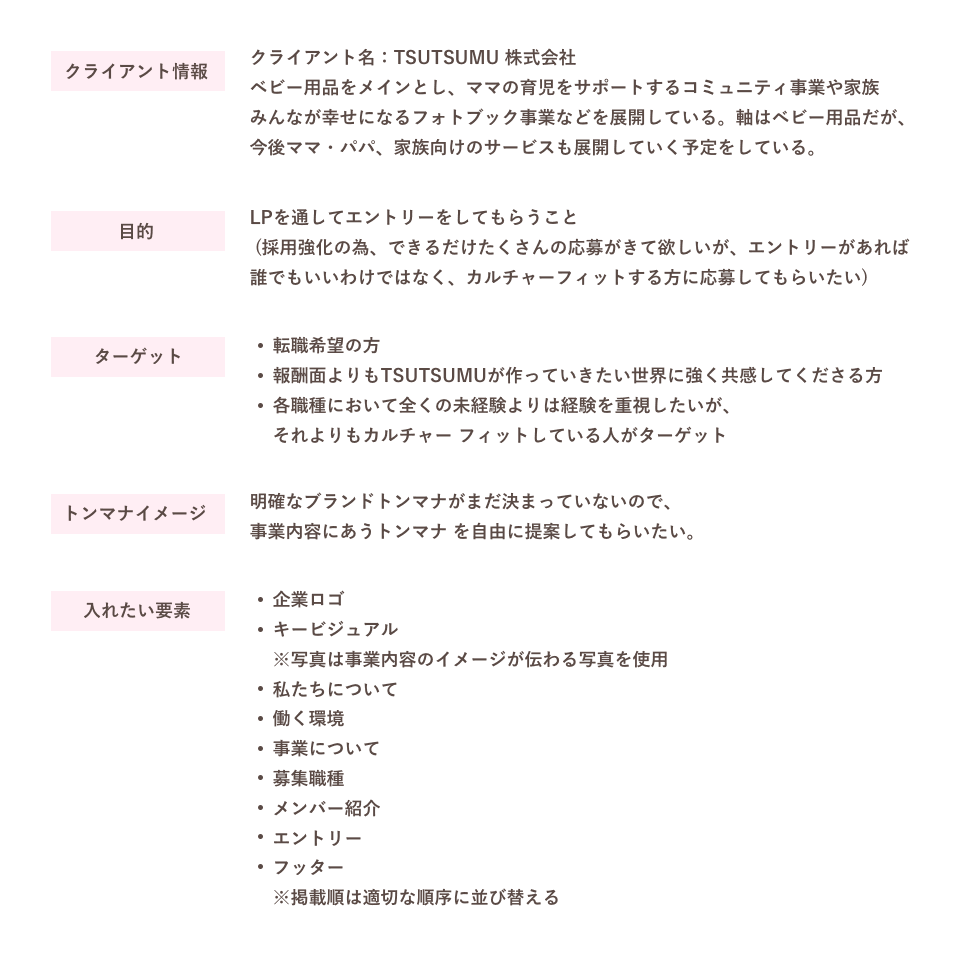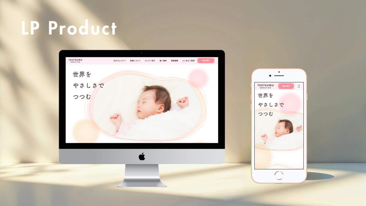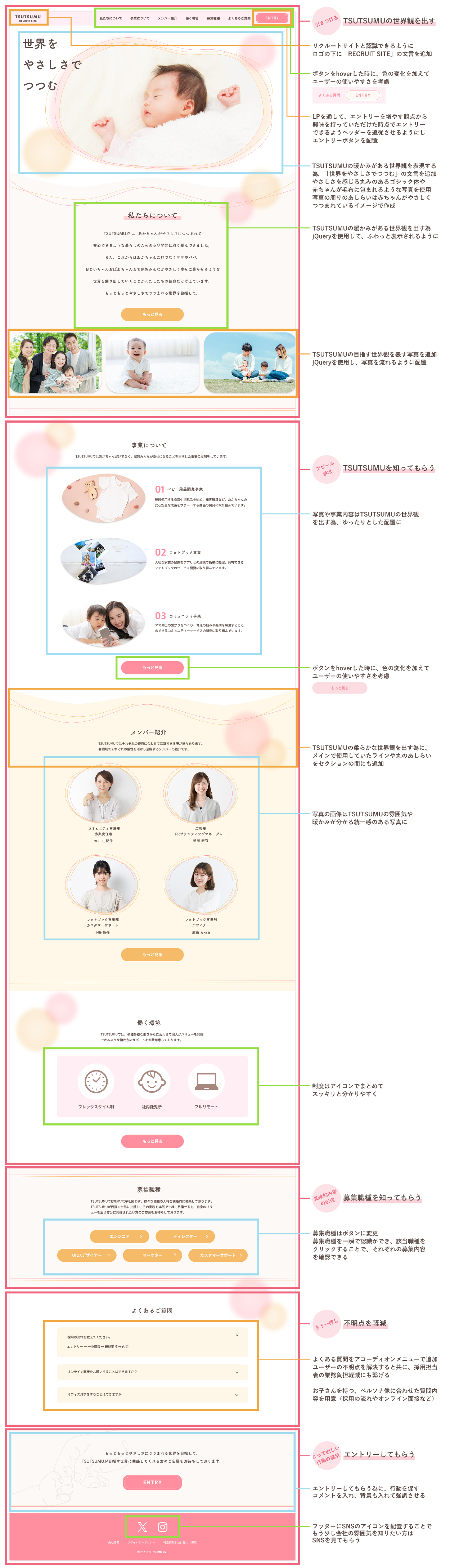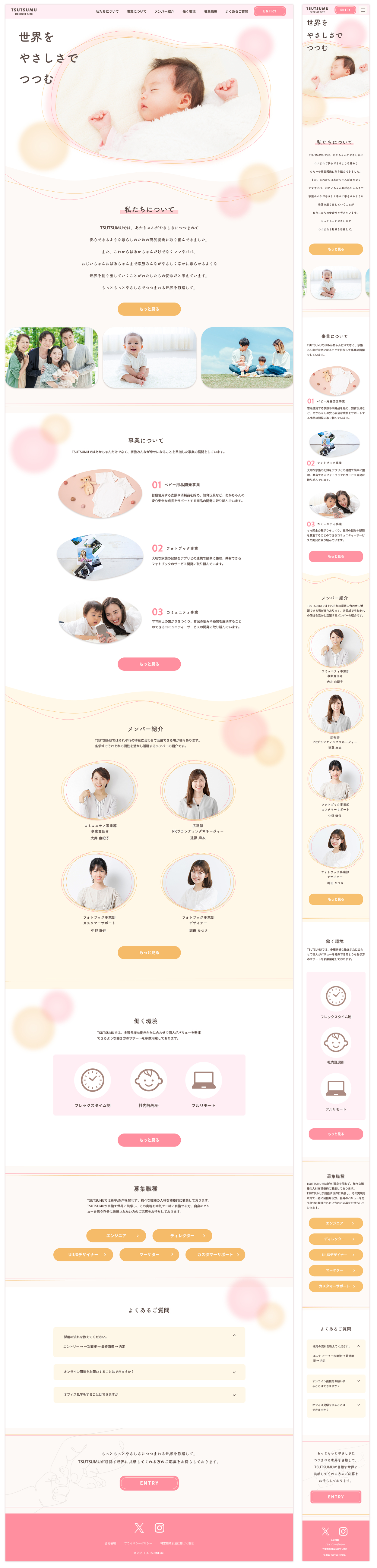 TSUTSUMUの暖かみのある世界観を伝える為に、温もりを感じさせるピンクや赤ちゃんを連想させる黄色を使用し、余白を多めにしてゆったりと柔らかなイメージで制作しました。また、採用サイトでもあるため、可愛くなりすぎず、スッキリとした見やすさも意識して制作を行いました。