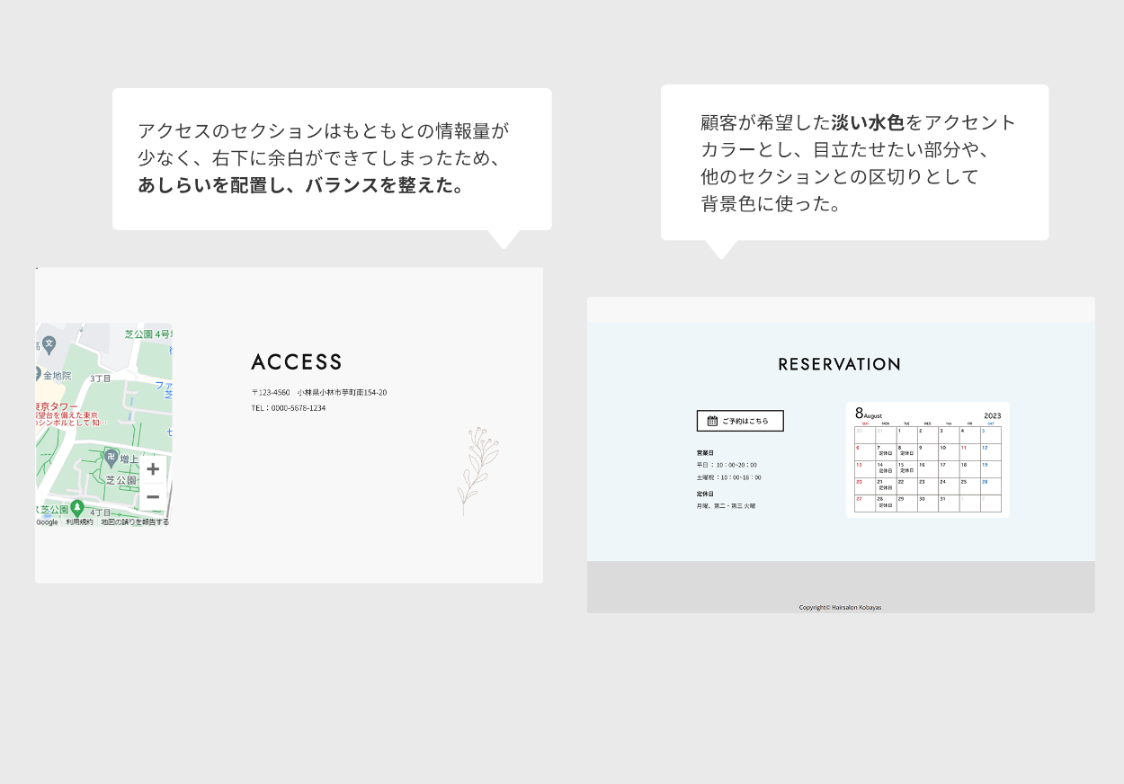 ・アクセスのセクションはもともとの情報量が少なく、右下に余白ができてしまったため、あしらいを配置し、バランスを整えた。