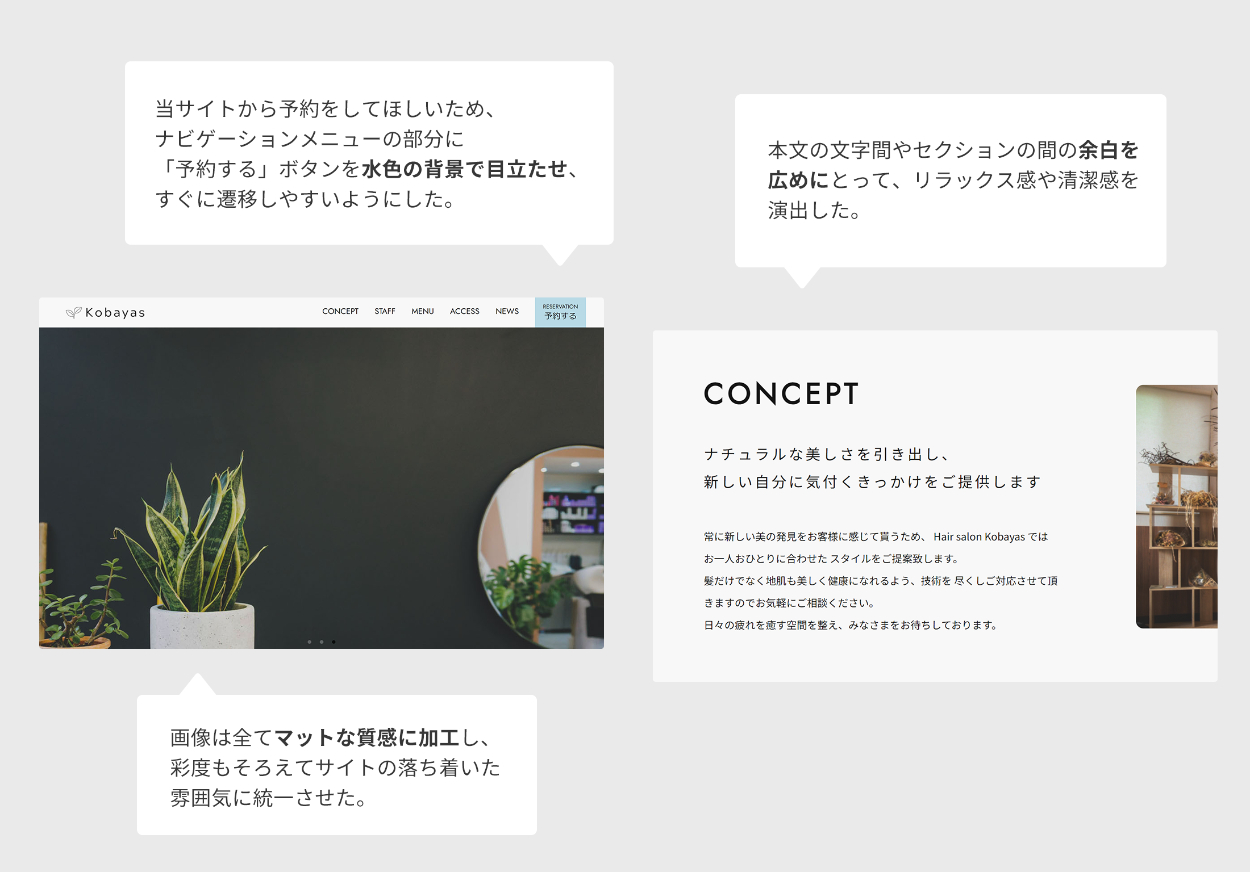 ・当サイトから予約をしてほしいため、ナビゲーションメニューの部分に「予約する」ボタンを水色の背景で目立たせて、すぐに遷移しやすいようにした。