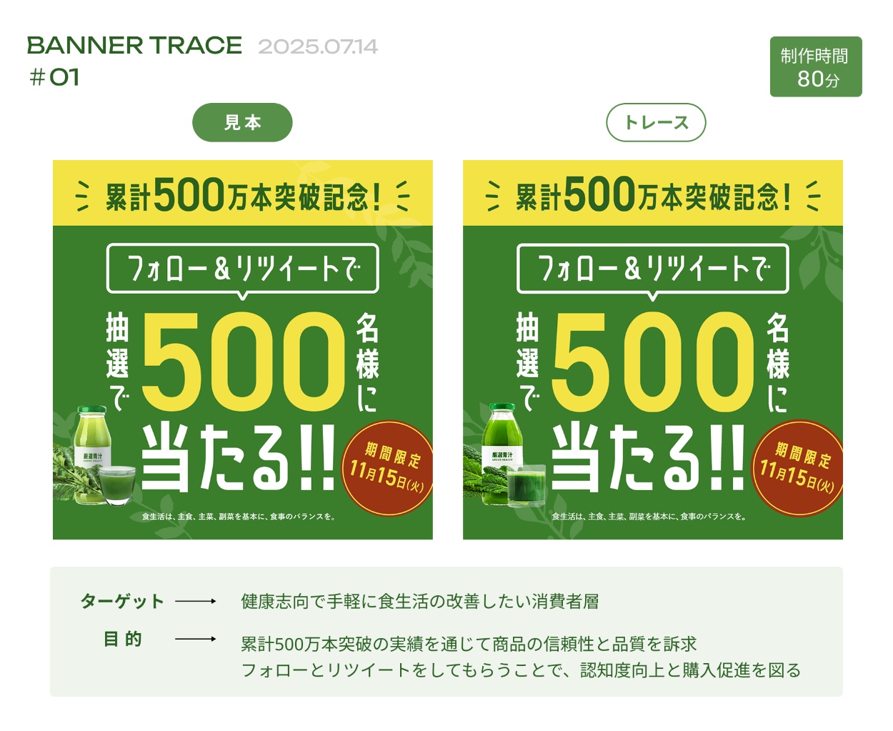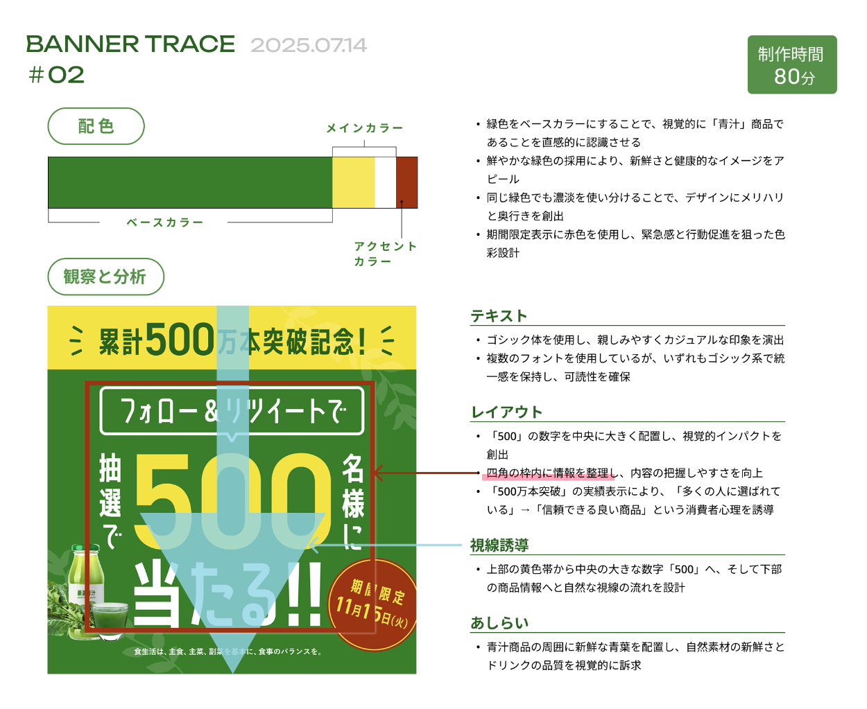 SHElikes PRO デザイナーコース 1つ目の課題としてバナートレース、および分析を行いました。[制作時間:トレース80分、分析シート60分 | 使用ツール:トレース Photoshop、分析シート Figma分析シート ]