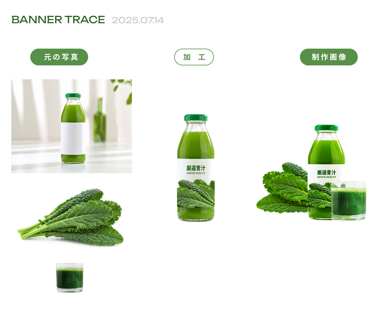 左下の写真については、ボトル、青菜、グラスをそれぞれ別の素材から切り抜いて使用しました。