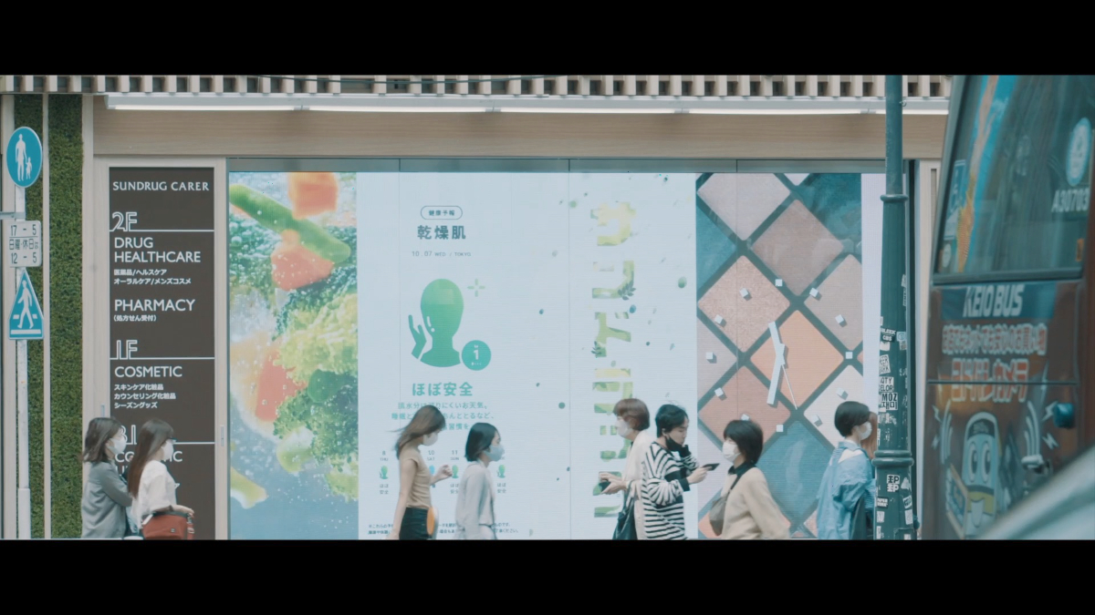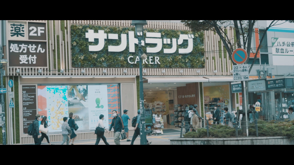 "SUNDRUG CARER Shibuya Ekimae Store" is a new style store of the drugstore retail chain "SUNDRUG", which operates nationwide in Japan. we were in charge of the total production and production of the 210-inch LED signage installed at the front of the store, including the planning of the contents to be broadcast, construction of the broadcasting system, and video production.