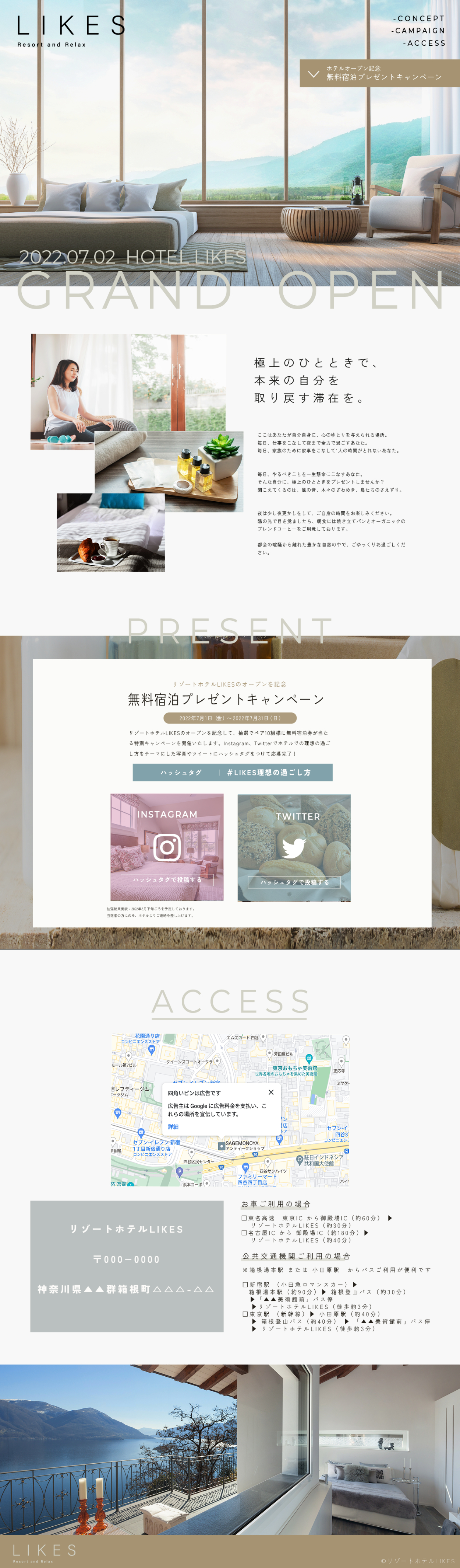 ・リゾートホテルLIKESの新規オープンを記念して、無料宿泊の特別キャンペーンを開催告知