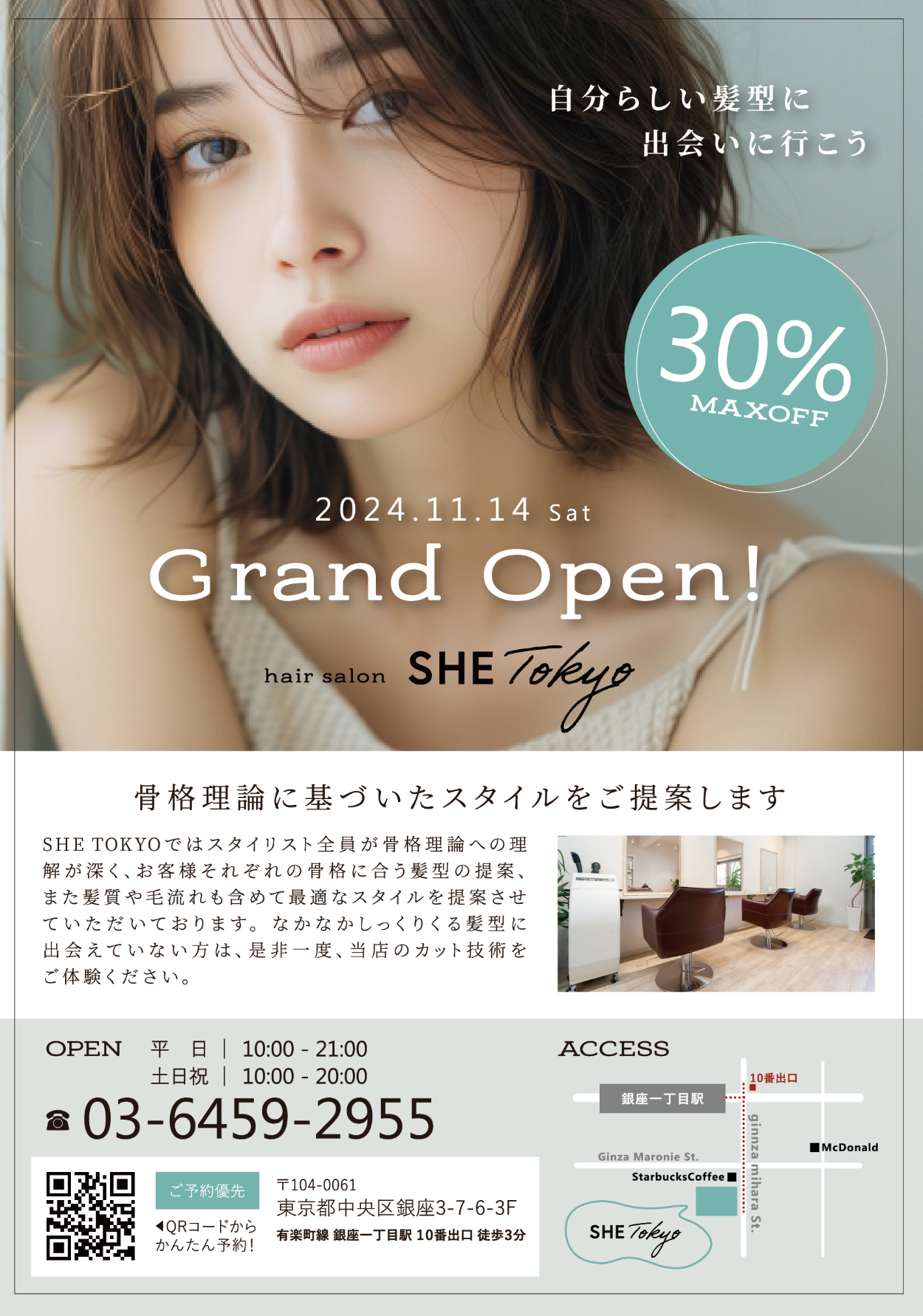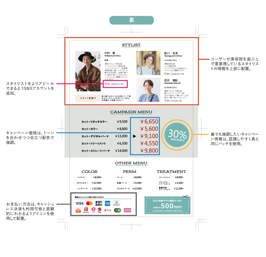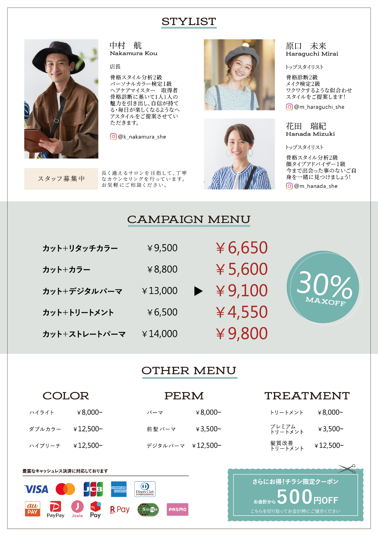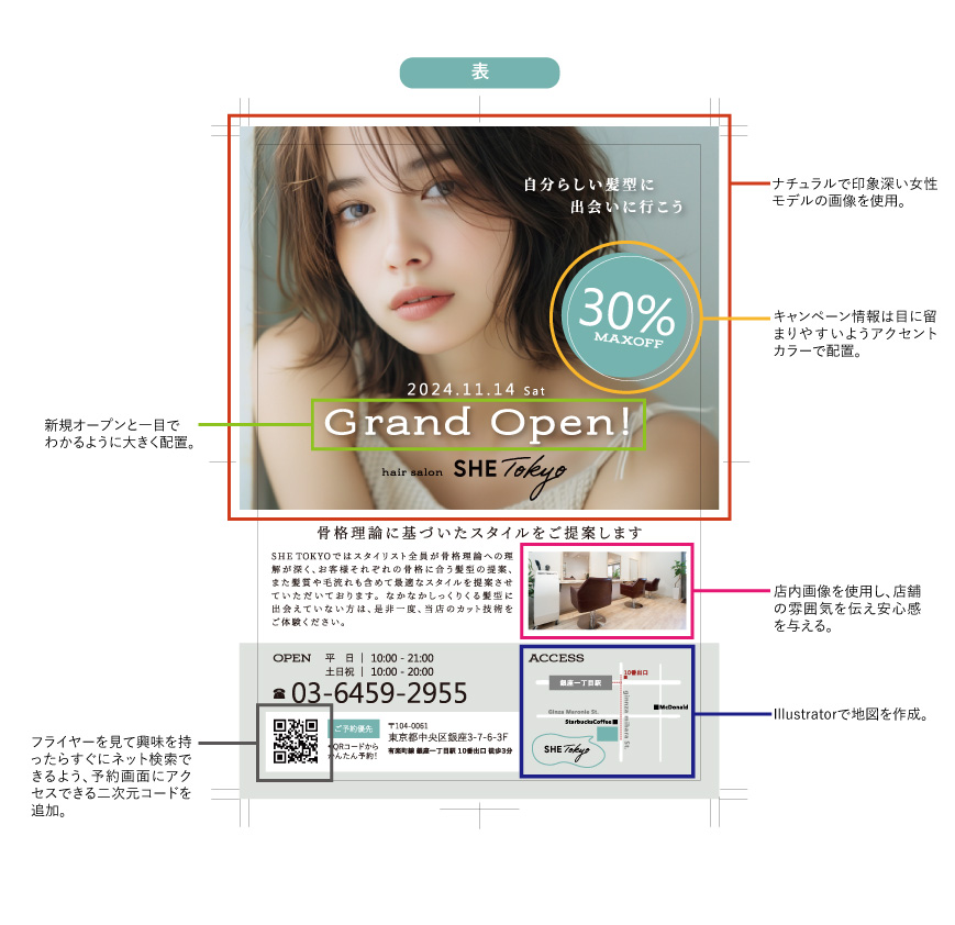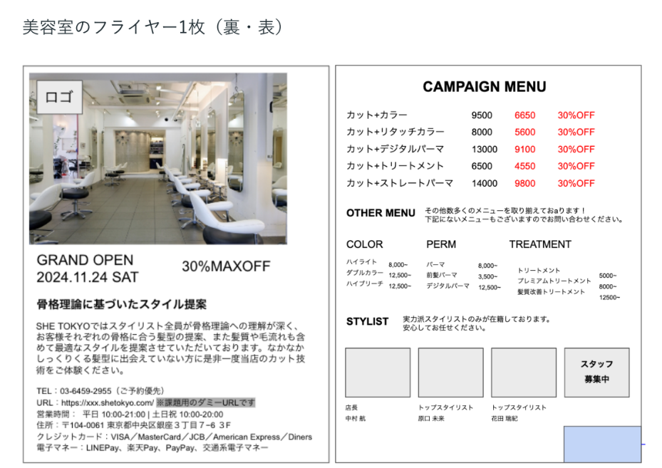 SHElikes MULTI CREATOR COURSEの課題。ヘアサロン新規オープンのキャンペーンフライヤー制作に取組みました。(制作時間:14時間)