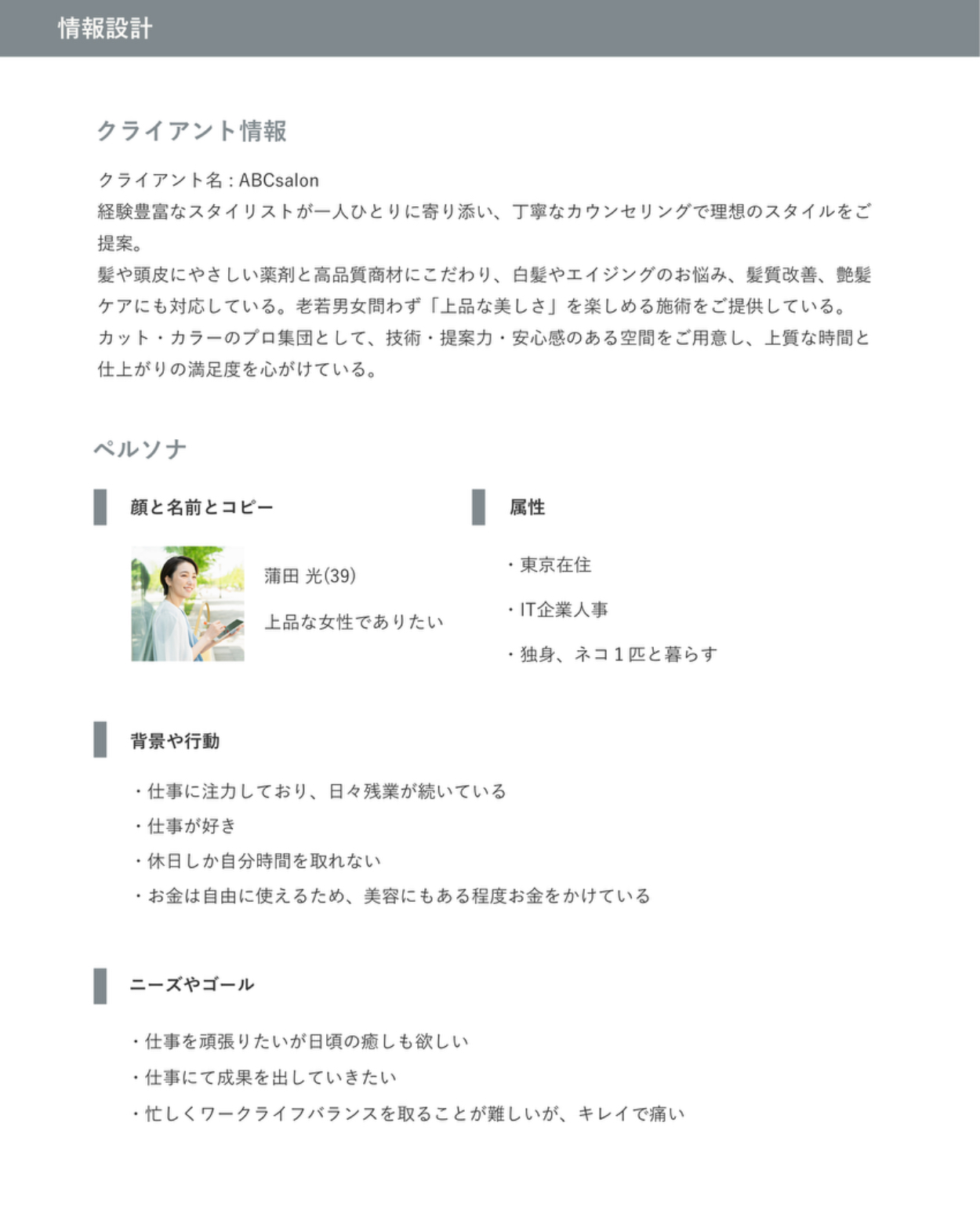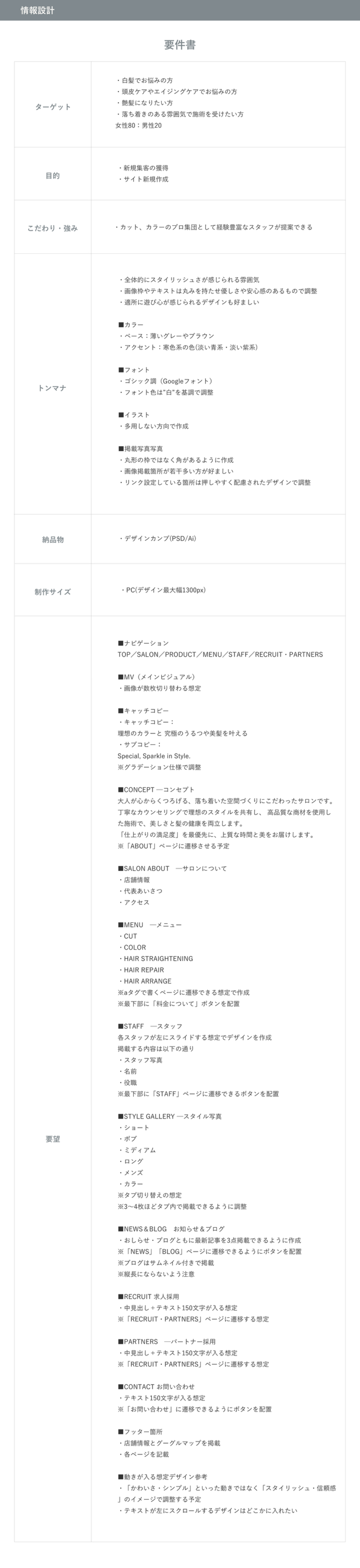 【自主制作】美容院HP Ayu WEBデザイナー OVERVIEW 美容院のHPデザイン制作に取り組みました。 クライアントからの要件を元に制作いたしました。 YEAR 2025 制作情報【所要時間】約2日【使用ツール】Photoshop 制作物・デザインカンプデザインカンプ要件定義情報設計ペルソナスタイルガイド
