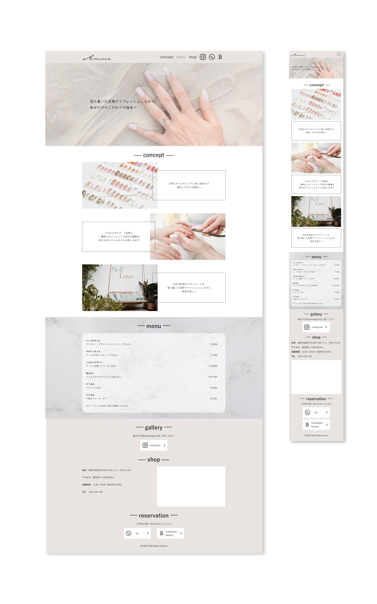 オリジナルwebサイト あかね webデザイナー OVERVIEW 架空のネイルサロンのサイトを作成しました。 【事業内容】ケアにこだわった、ニュアンスネイルや繊細なアートを得意とするプライベートネイルサロン【目的】webサイトでサロンを知ってもらい予約につなげたい【ターゲット】20〜30代の女性【工夫した所】おしゃれで抜け感のある印象にしたいのでアースカラーを基調にしたデザインにしました。落ち着きを与えるために余白を大きく、シンプルなデザインにしました。