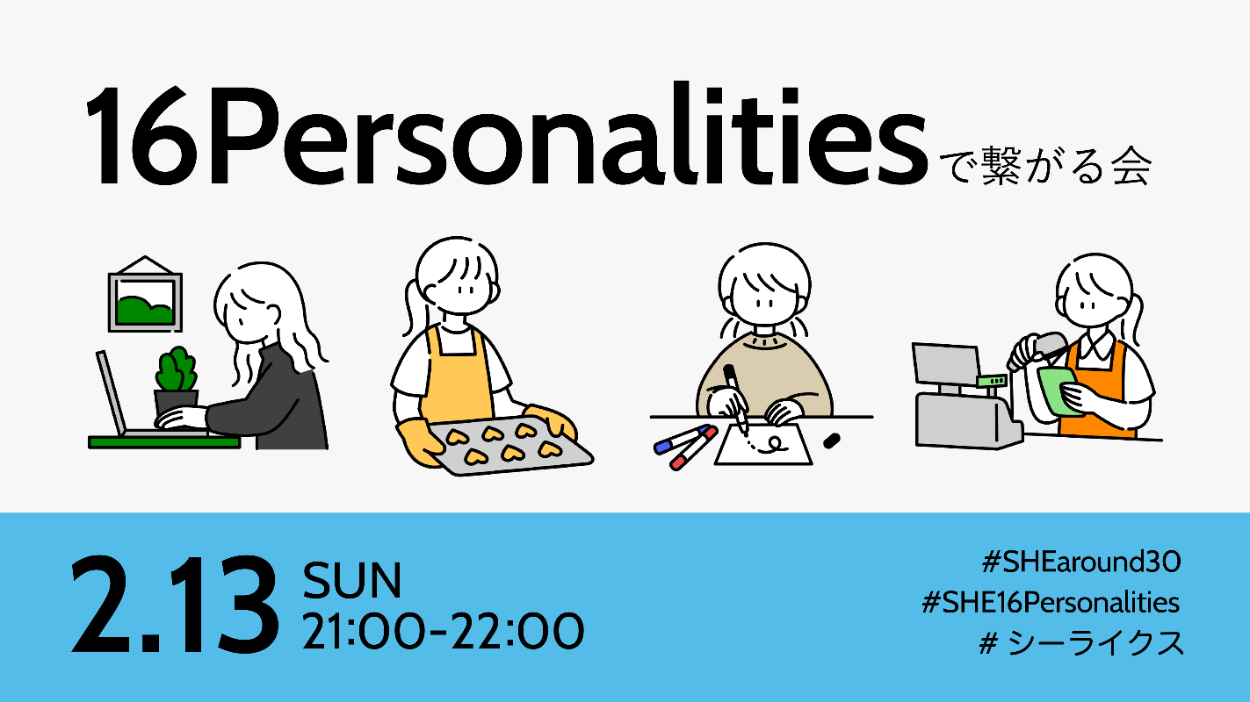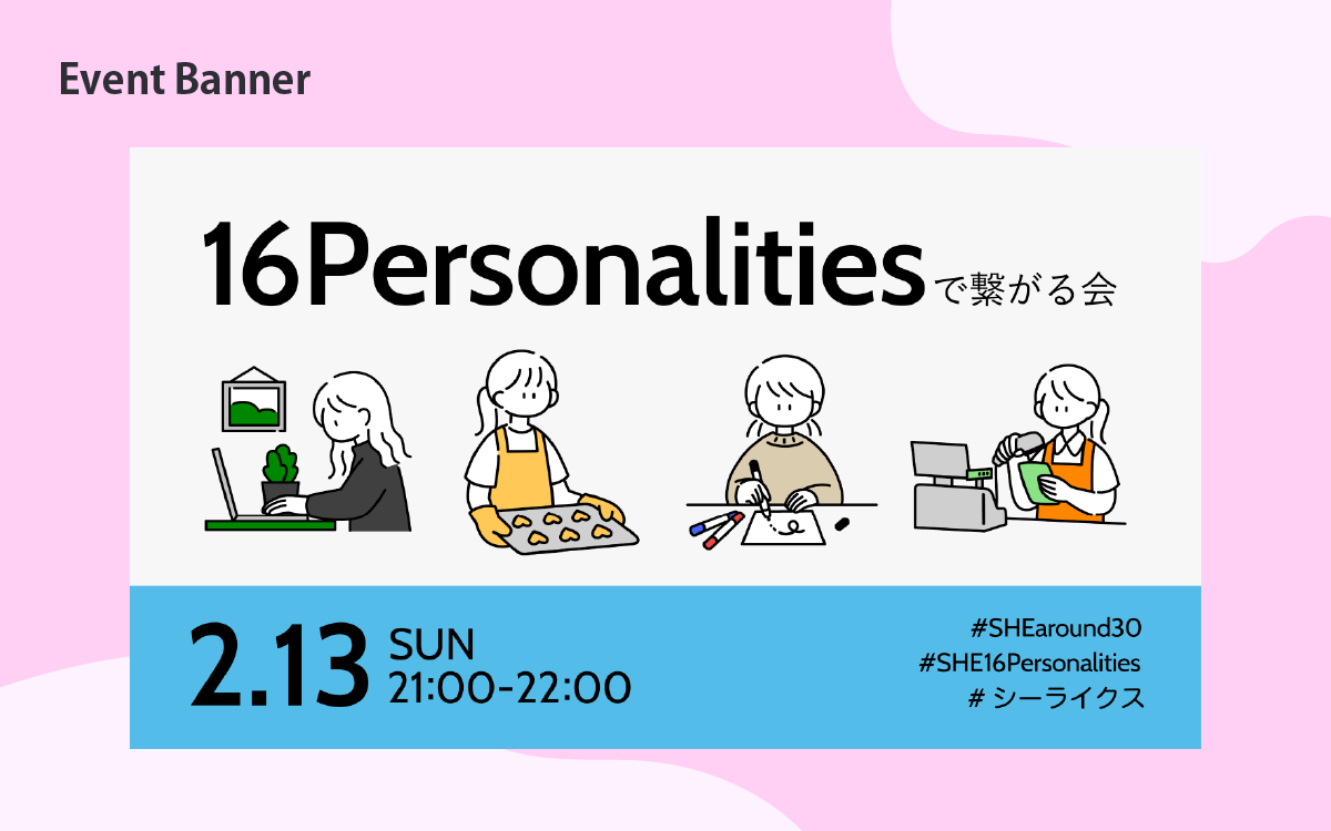 ミレニアムライフコーチングカンパニーであるSHE株式会社様のコミュニティプランナーをしていた際に制作したイベント告知のためのバナーです。 『16Personalities』をテーマに、イベントの企画立案からヴィジュアルデザイン(バナー制作)まで行いました。