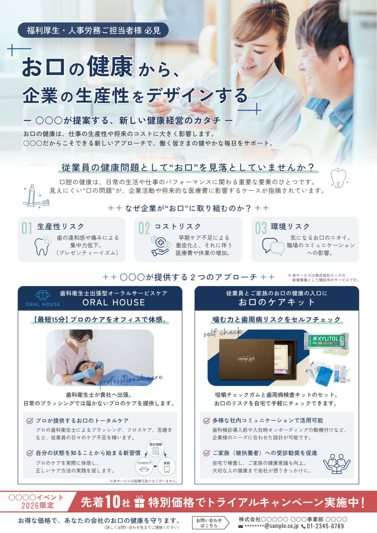 新規福利厚生サービス(出張型歯科検診および口腔ケアキット)の展示会配布用チラシ。事業の立ち上げ期において、サービス内容の認知だけでなく、「なぜ企業が口腔ケアに取り組むべきか」という経営課題としての必要性を訴求し、導入検討の引き合いを獲得することを目的とした。