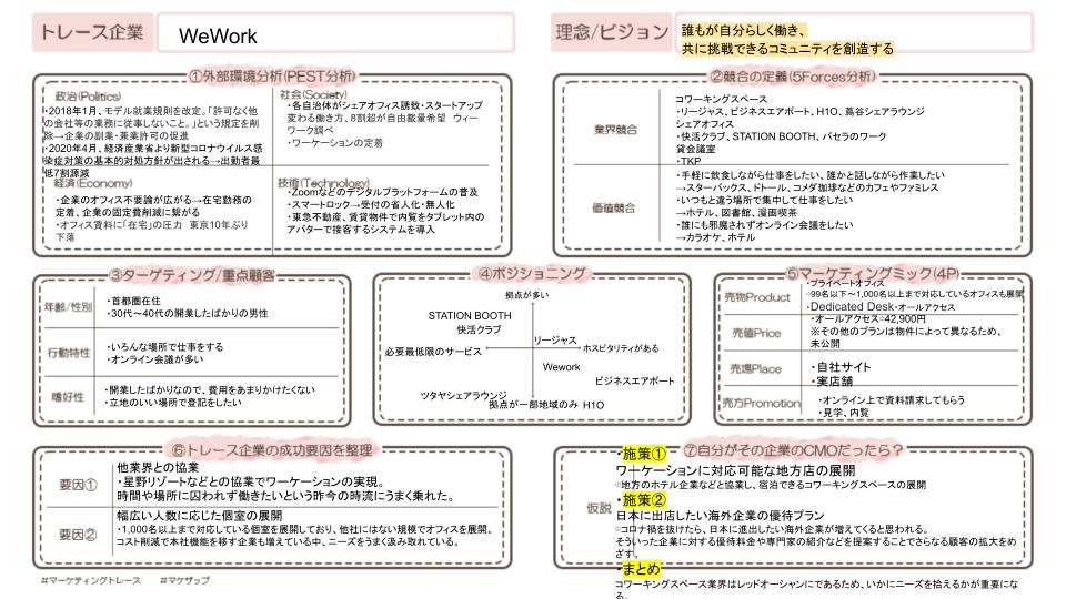 今回のマーケティングトレースを一枚にまとめた物が上記の1枚で、フレームワークを使った分析は下記になります。