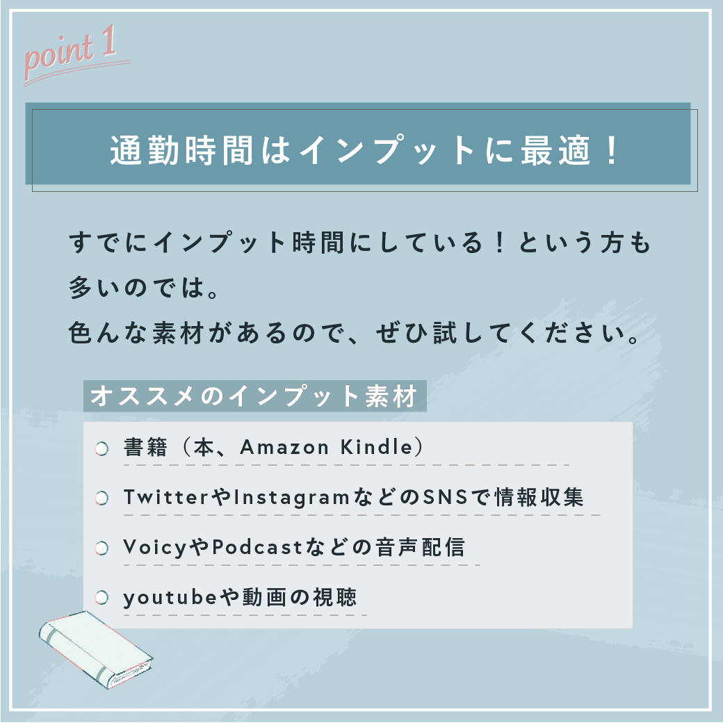 通勤時間が長いことはマイナスに捉えがちですが、実は通勤時間にたくさんのインプットやアウトプットができていることに気がつきました。
